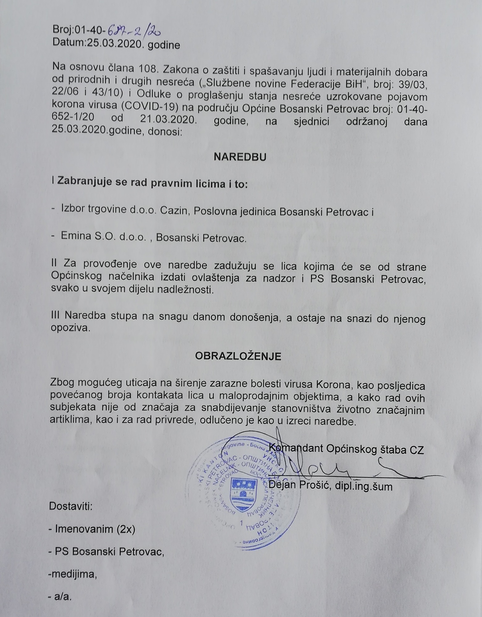Naredbe Štaba civilne zaštite, 25.03.2020.god.