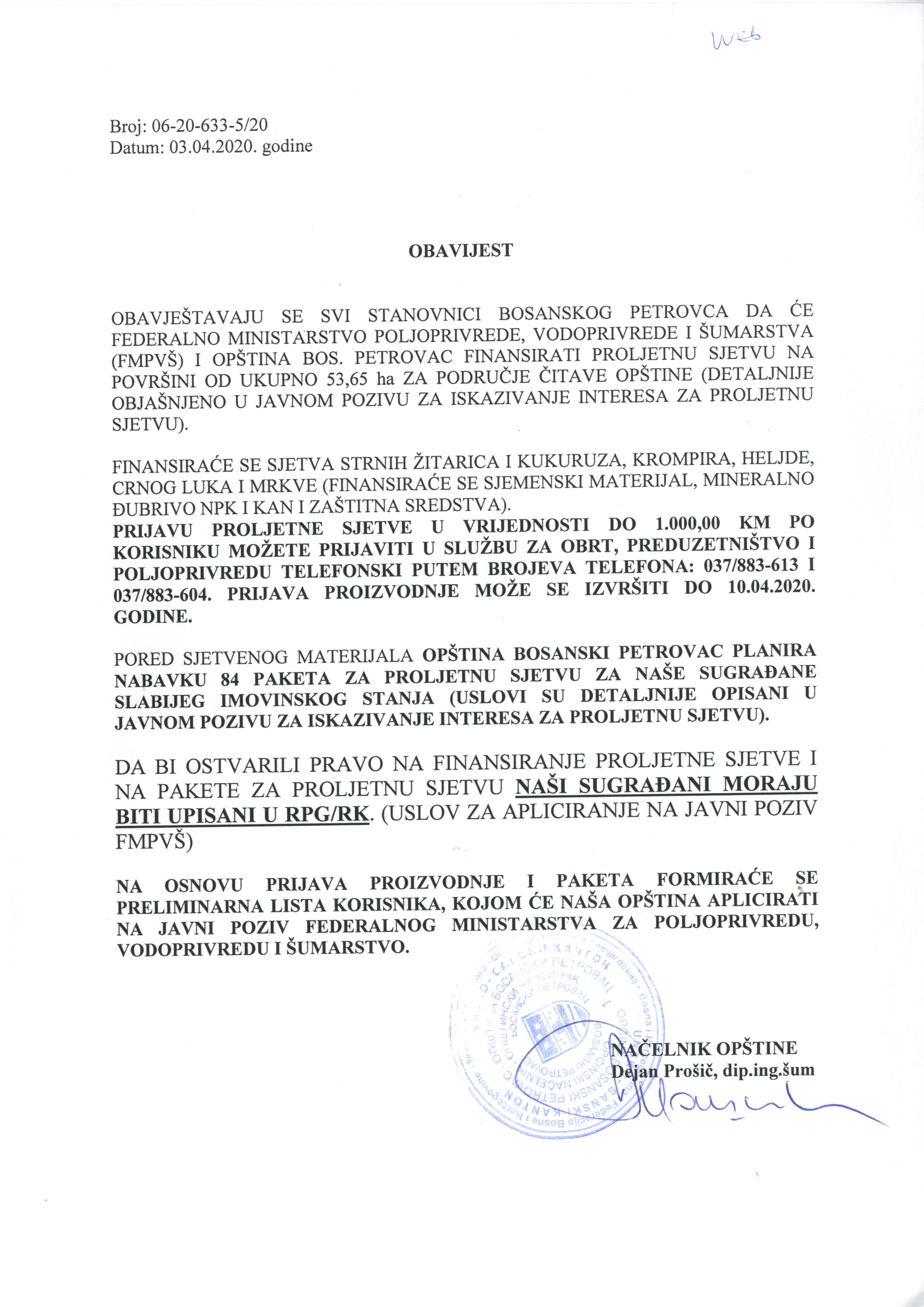Javni poziv za iskazivanje interesa za poljoprivrednu sjetvu