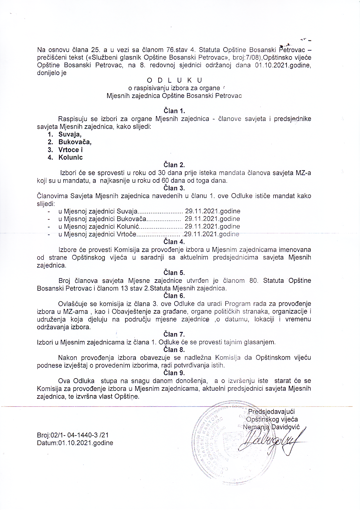 Raspisivanje izbora za članove savjeta MZ Kolunić, MZ Vrtoče, MZ Suvaja i MZ Bukovača
