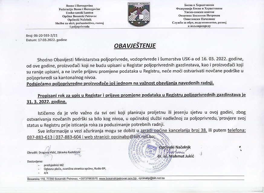 Obavještenje za poljoprivredne proizvođače