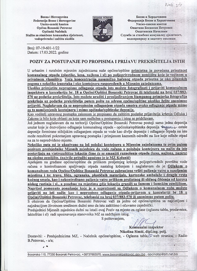 Poziv za postupanje po propisima i prijavu prekršitelja istih