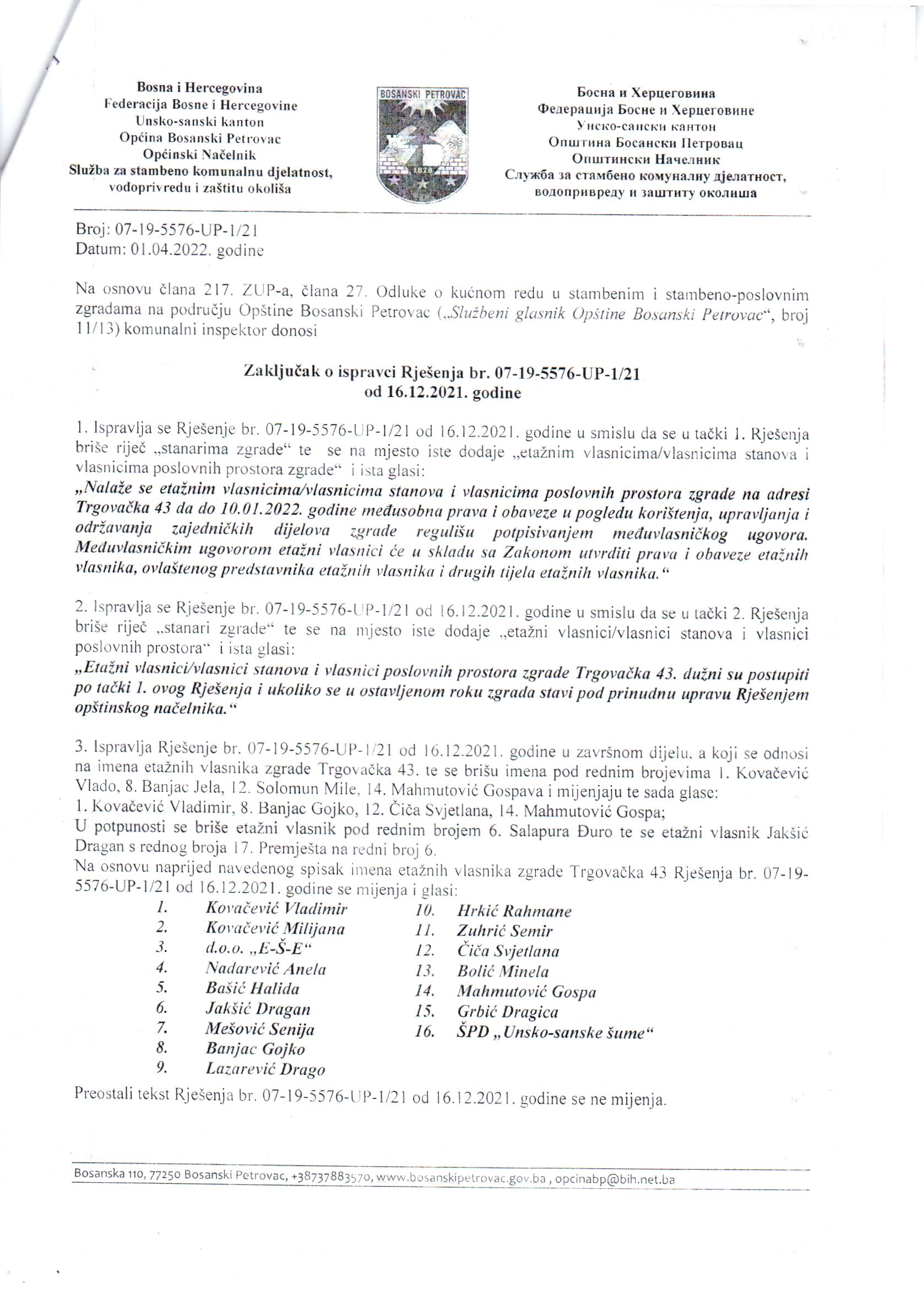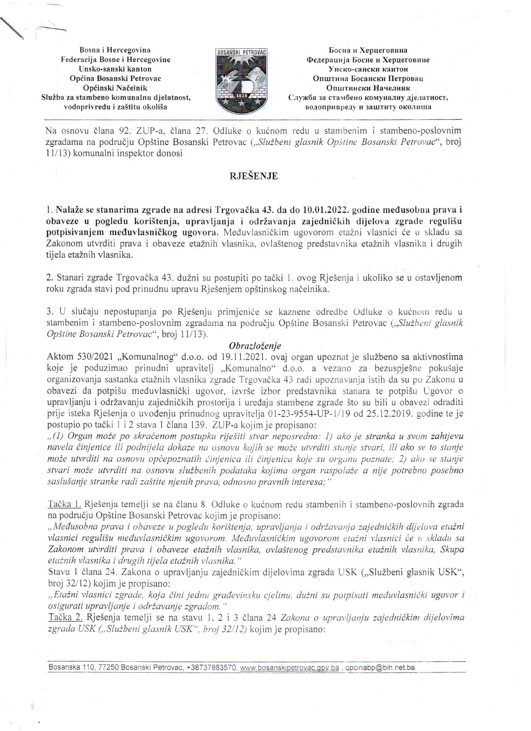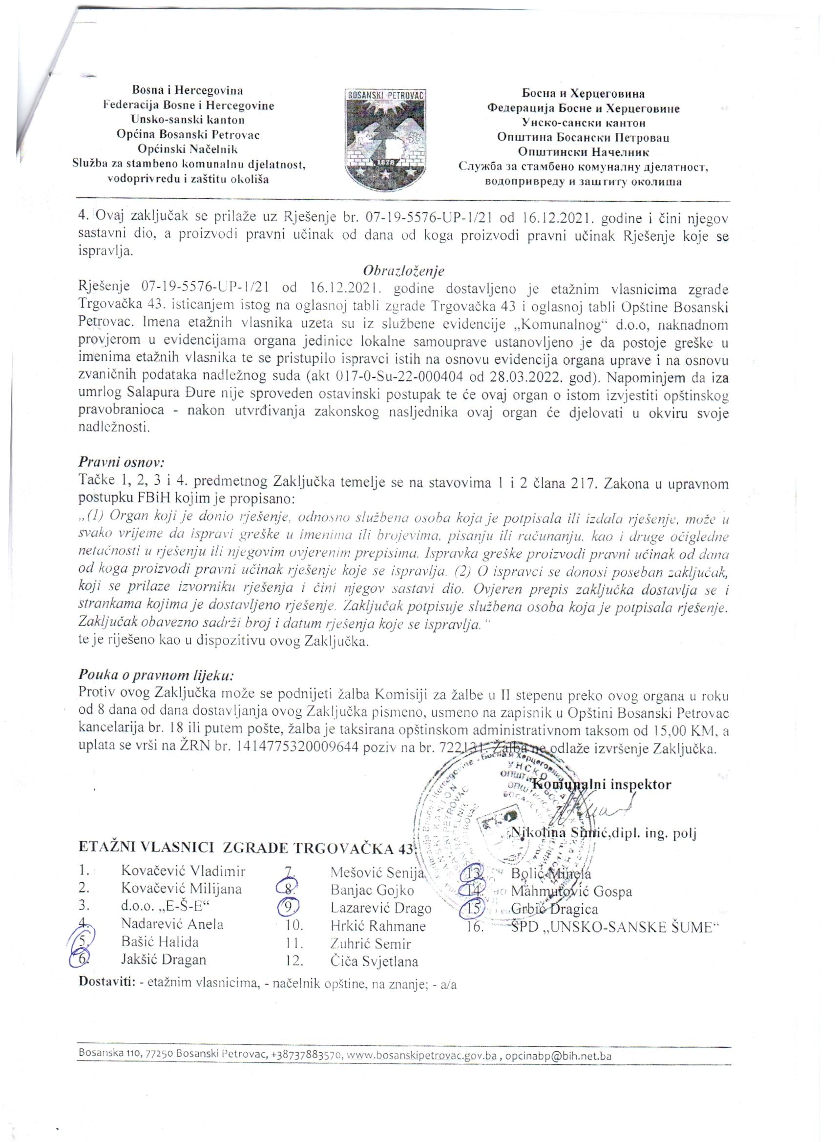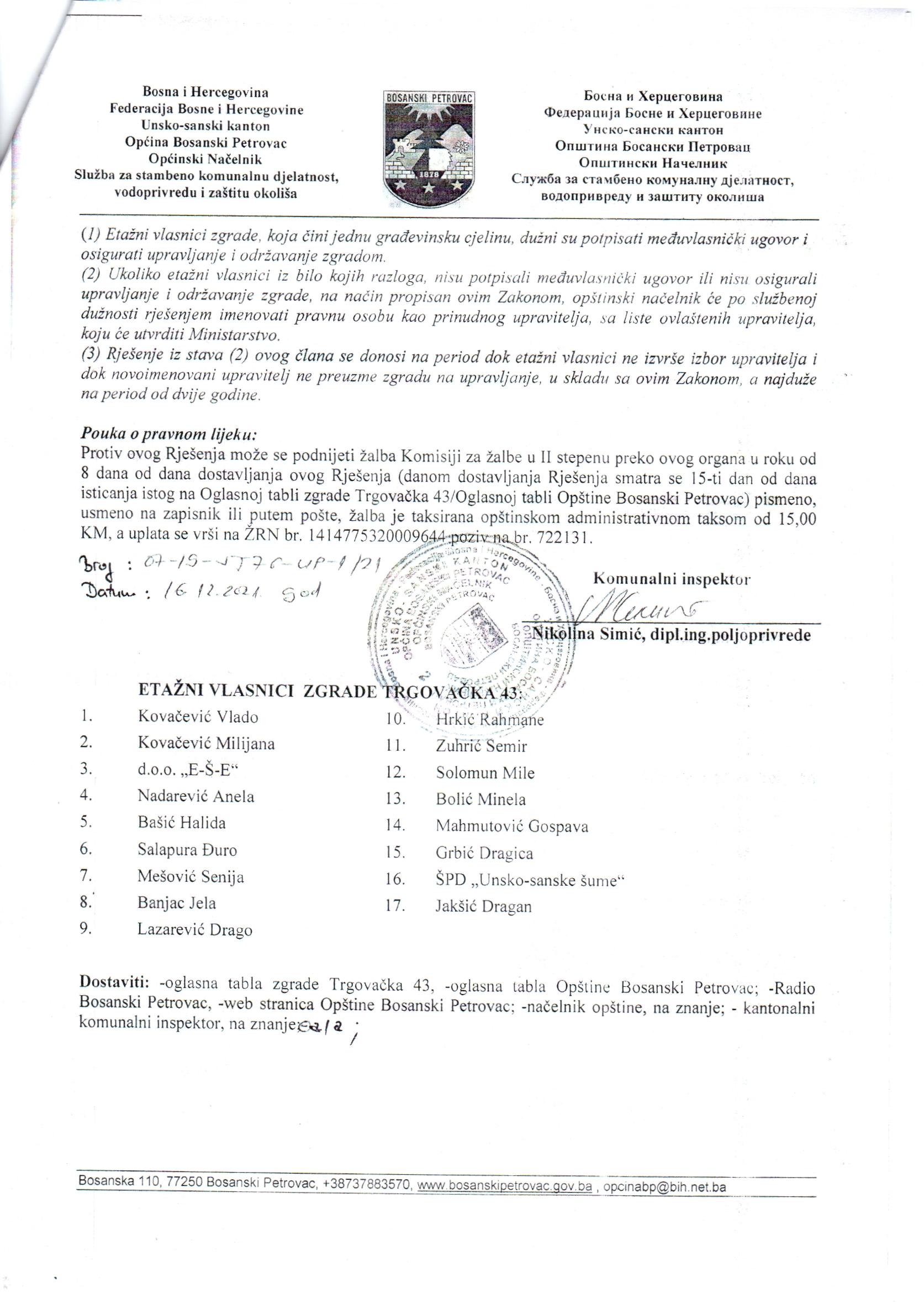 Poziv za vlasnike stanova ili poslovnih prostora u zgradi Trgovačka 43