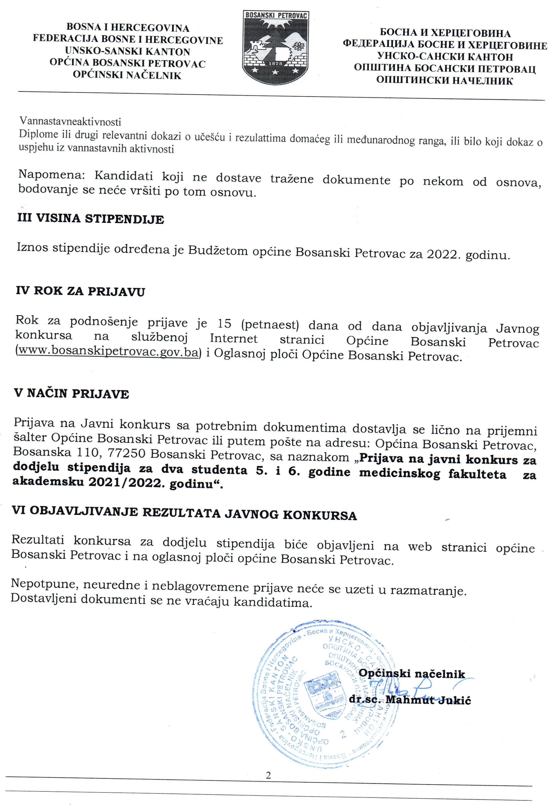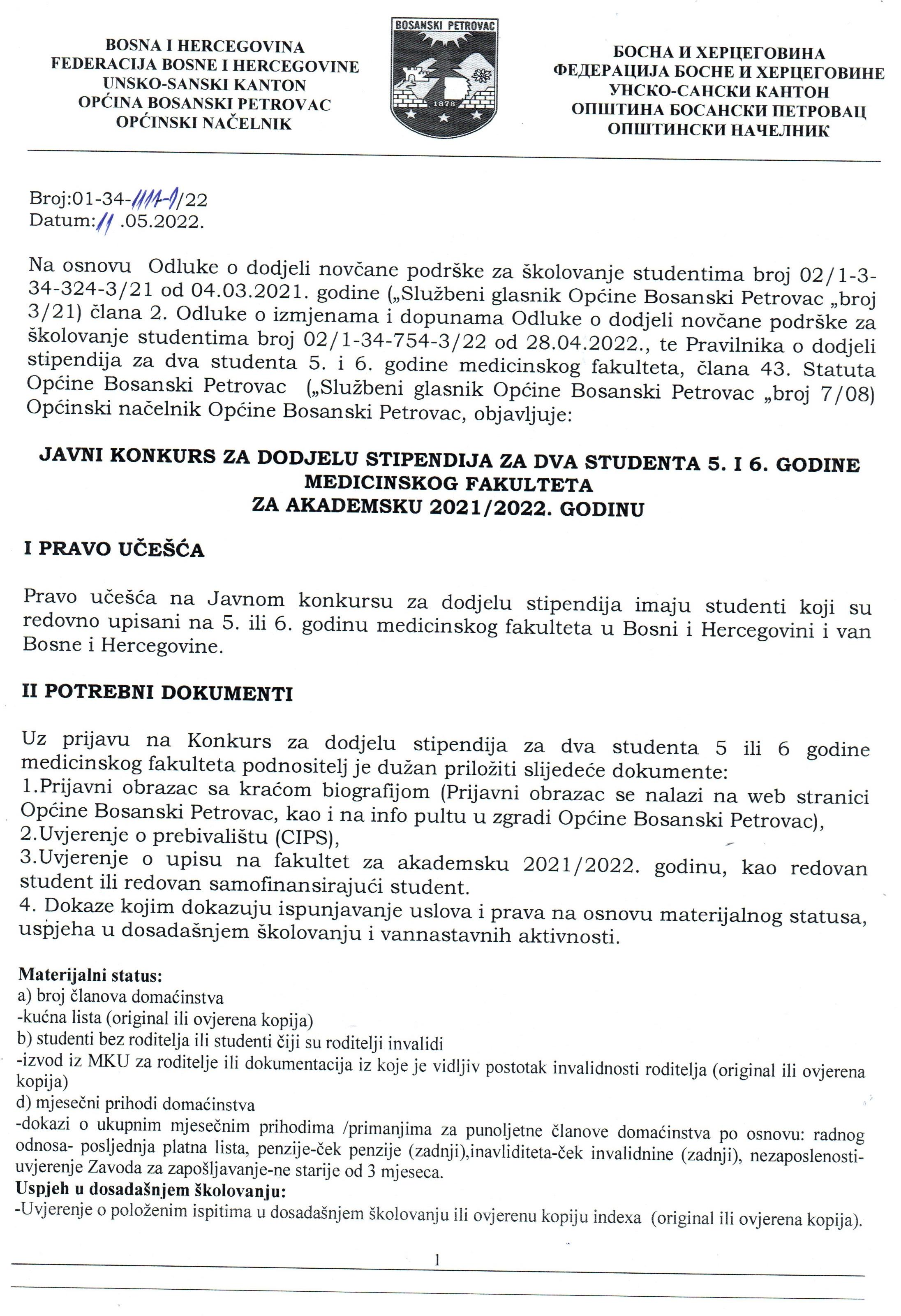 JAVNI KONKURS ZA DODJELU STIPENDIJA ZA DVA STUDENTA 5. I 6. GODINE MEDICINSKOG FAKULTETA ZA AKADEMSKU 2021/2022. GODINU