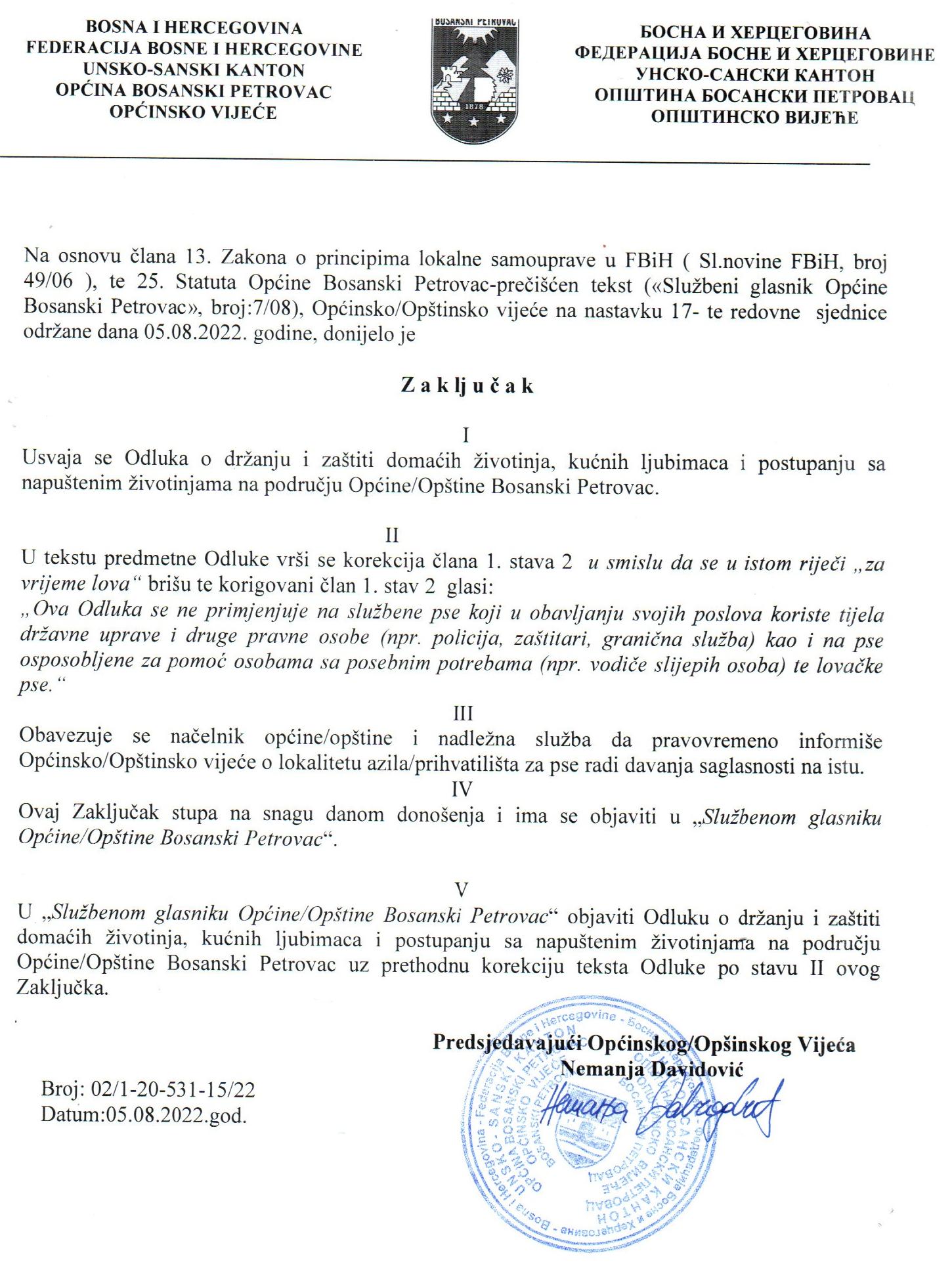 Usvojena odluka o držanju i zaštiti domaćih životinja, kućnih ljubimaca i postupanje sa napuštenim životinjama