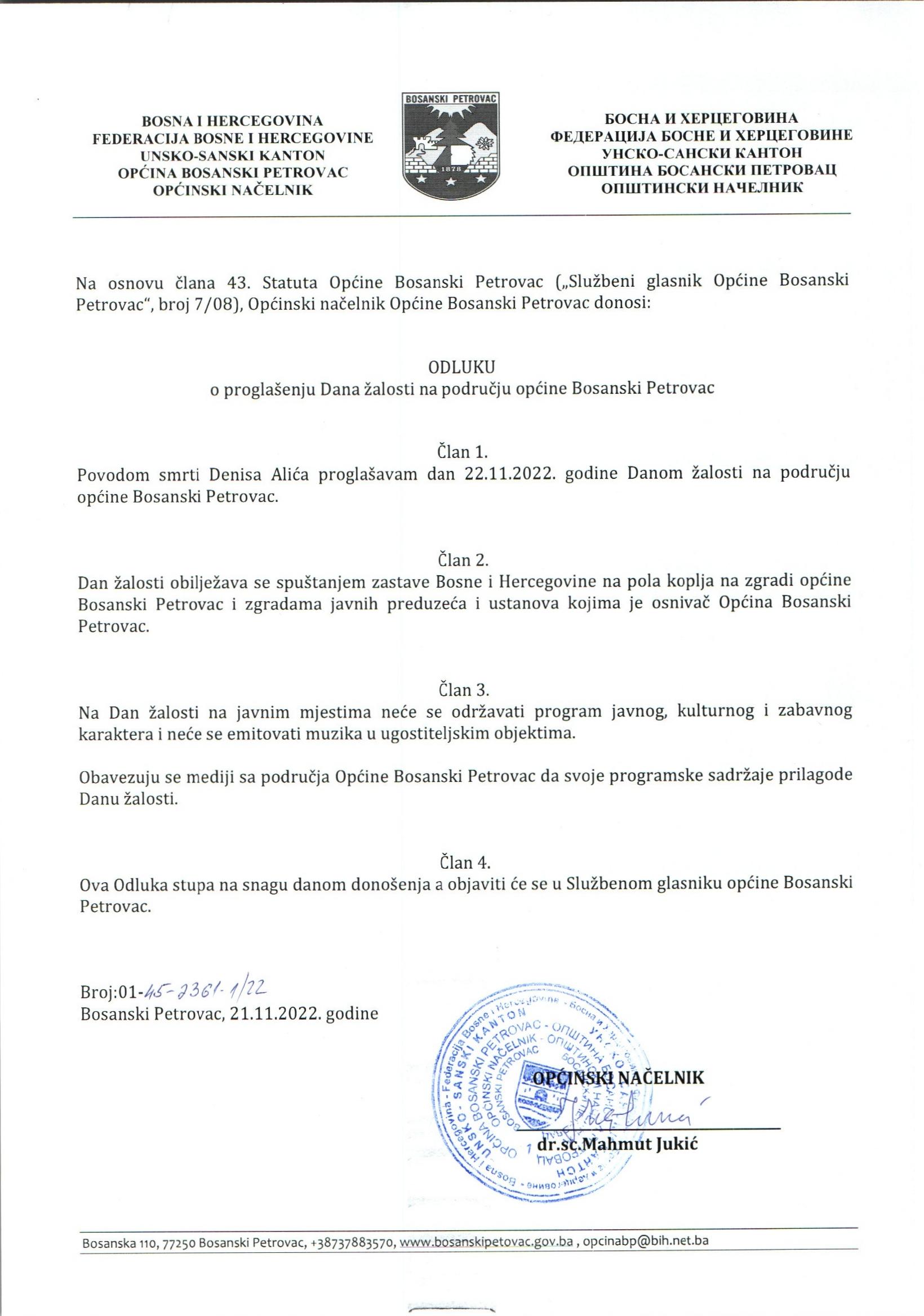 Proglašenje Dana žalosti na području općine Bosanski Petrovac - 22.11.2022.