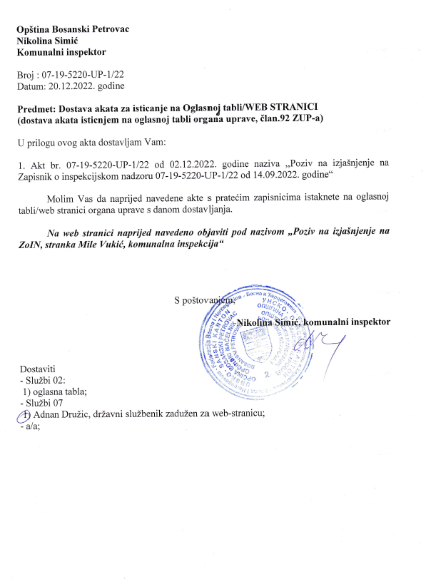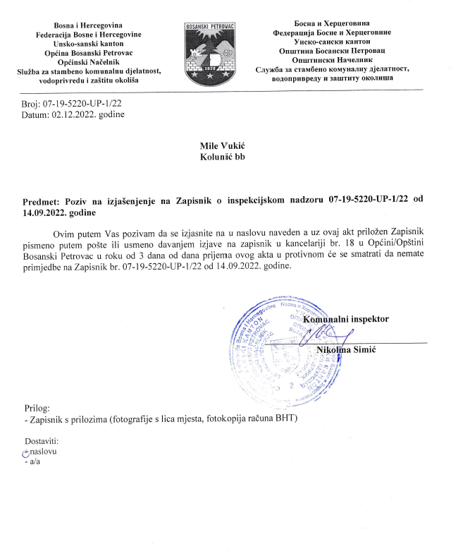 „Poziv na izjašnjenje na ZoIN, stranka Mile Vukić, komunalna inspekcija“