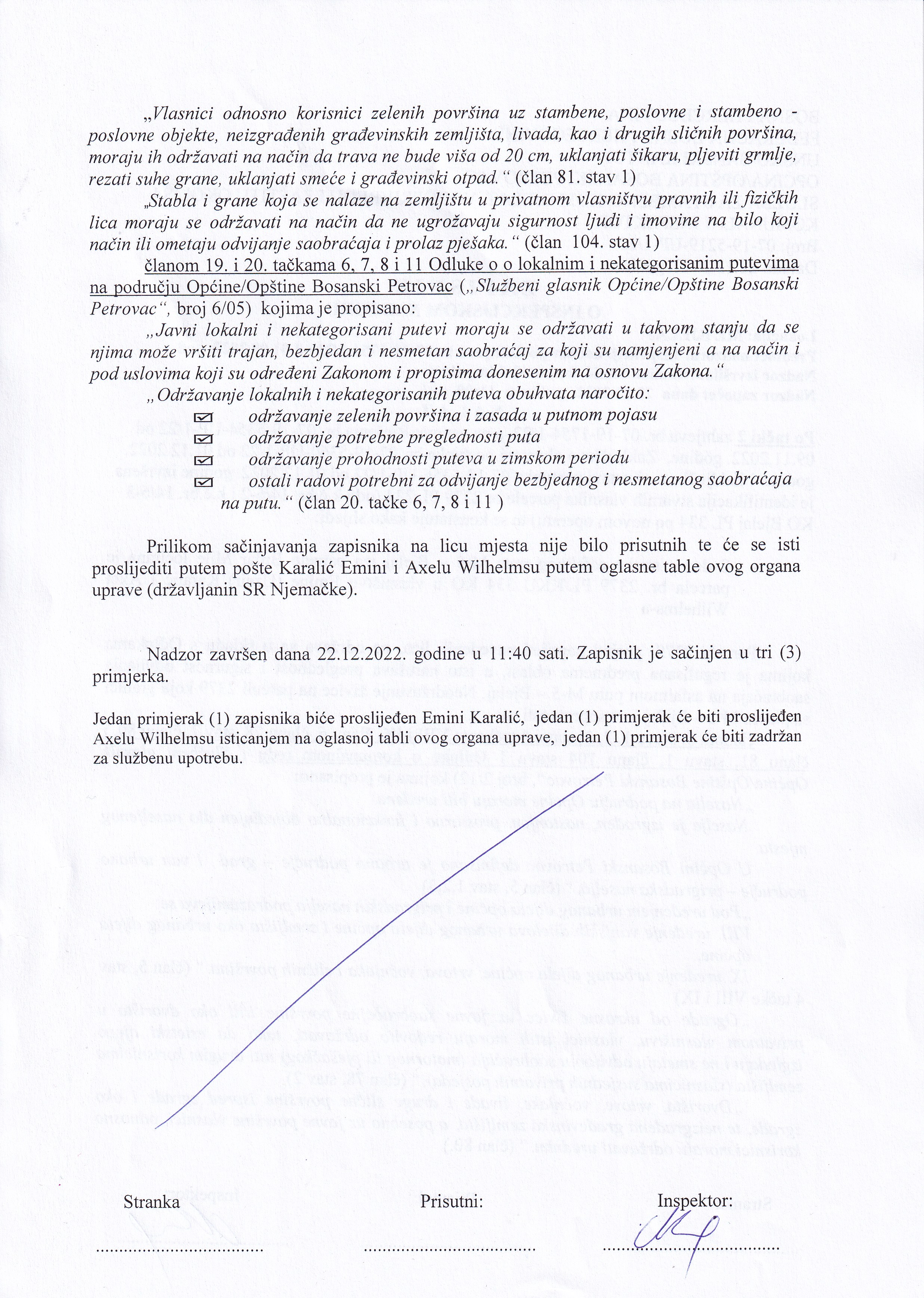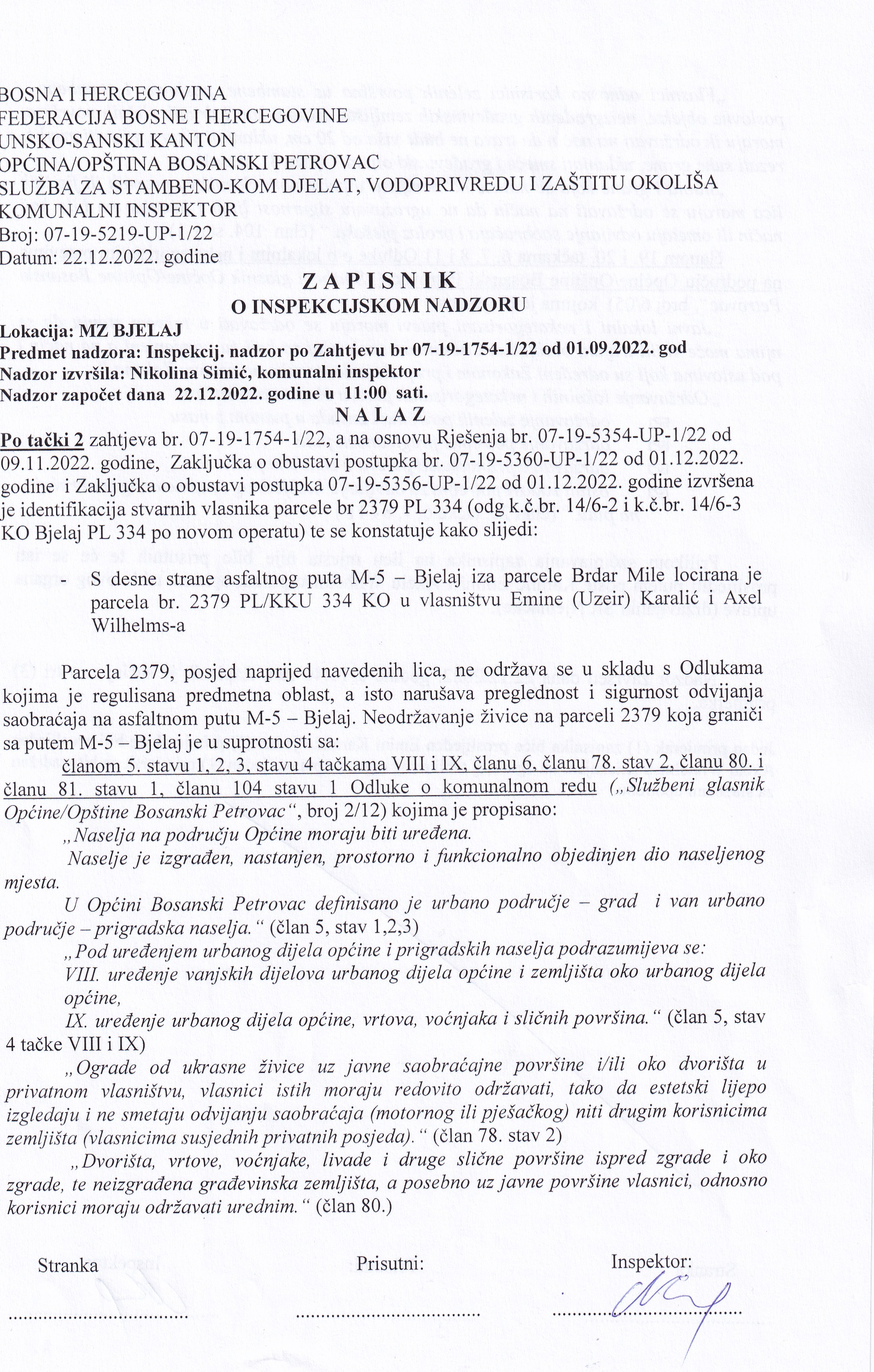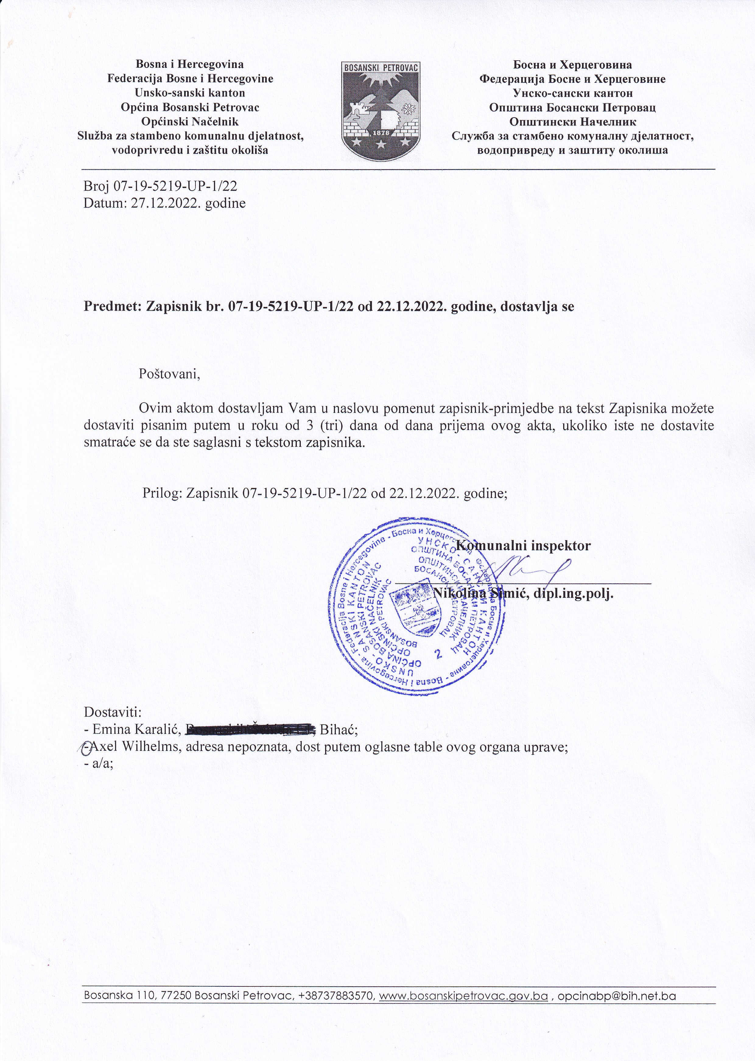 Zapisnik br. 07-19-5219-UP-1/22 od 22.12.2022. godine, dostavlja se, stranka Axel Wilhelms, komunalna inspekcija"
