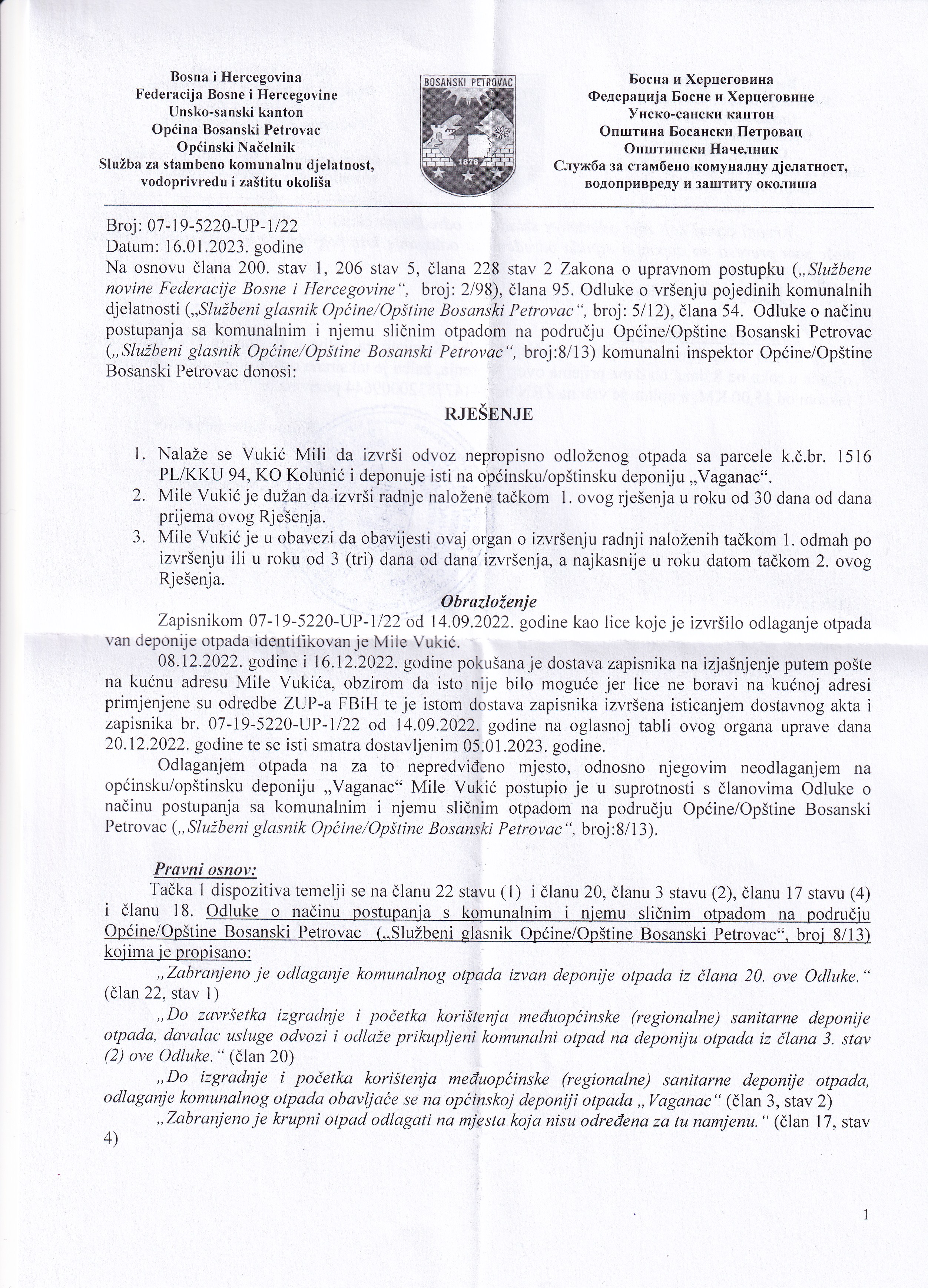 Rješenje, stranka: Mile Vukić, komunalna inspekcija
