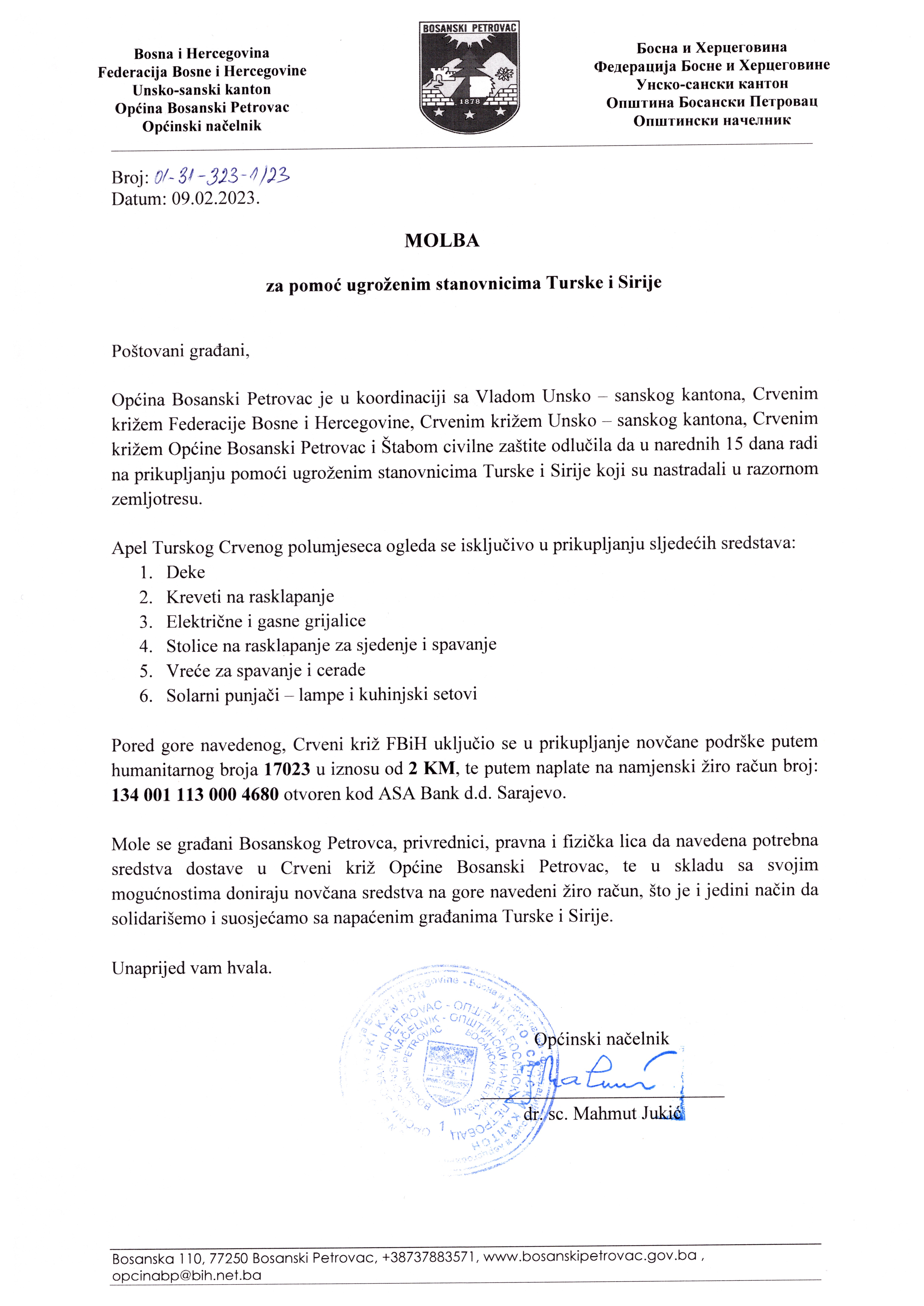 MOLBA za pomoć ugroženim stanovnicima Turske i Sirije