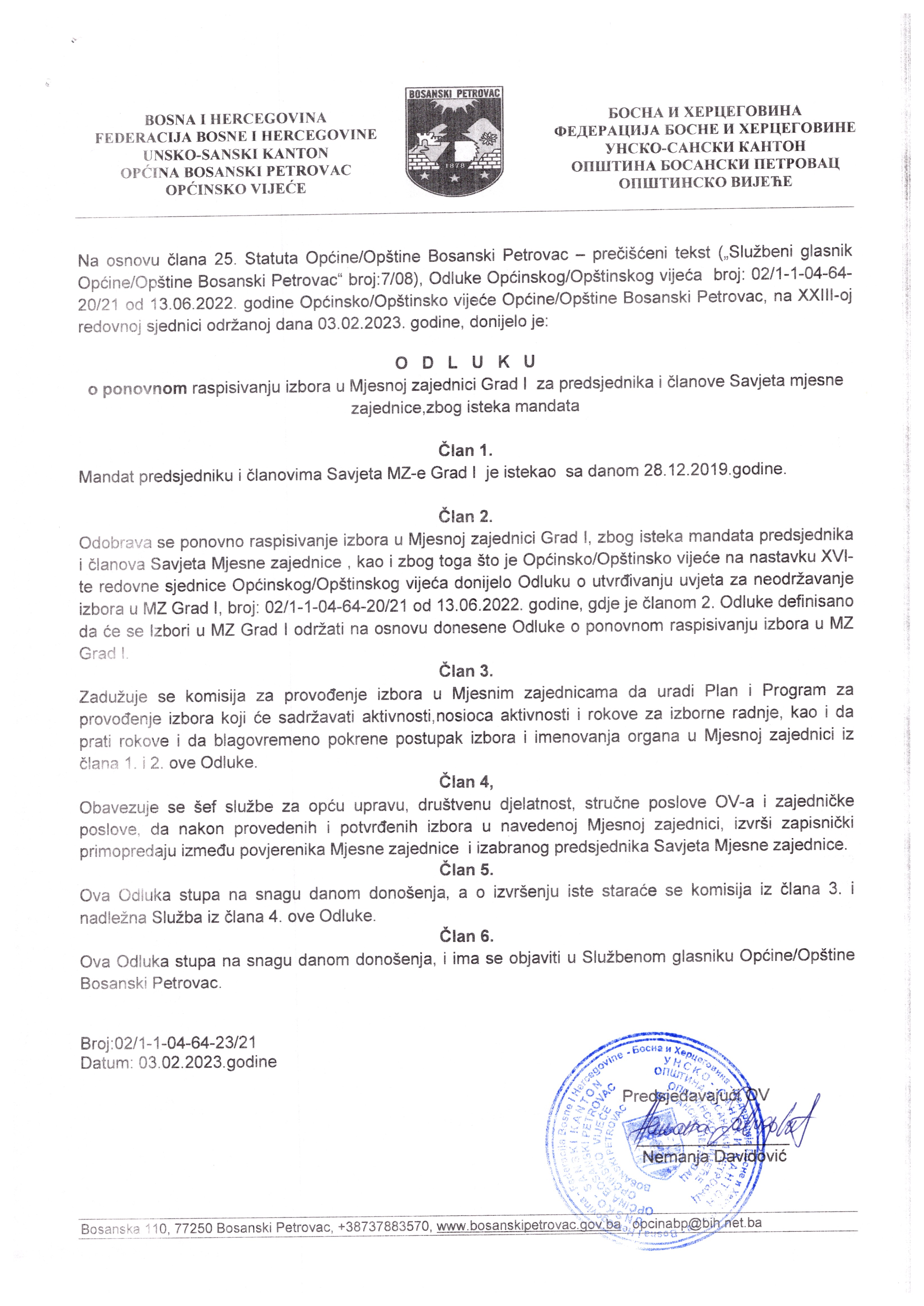 Odluka Općinskog vijeća o ponovnom raspisivanju izbora u MZ Grad I