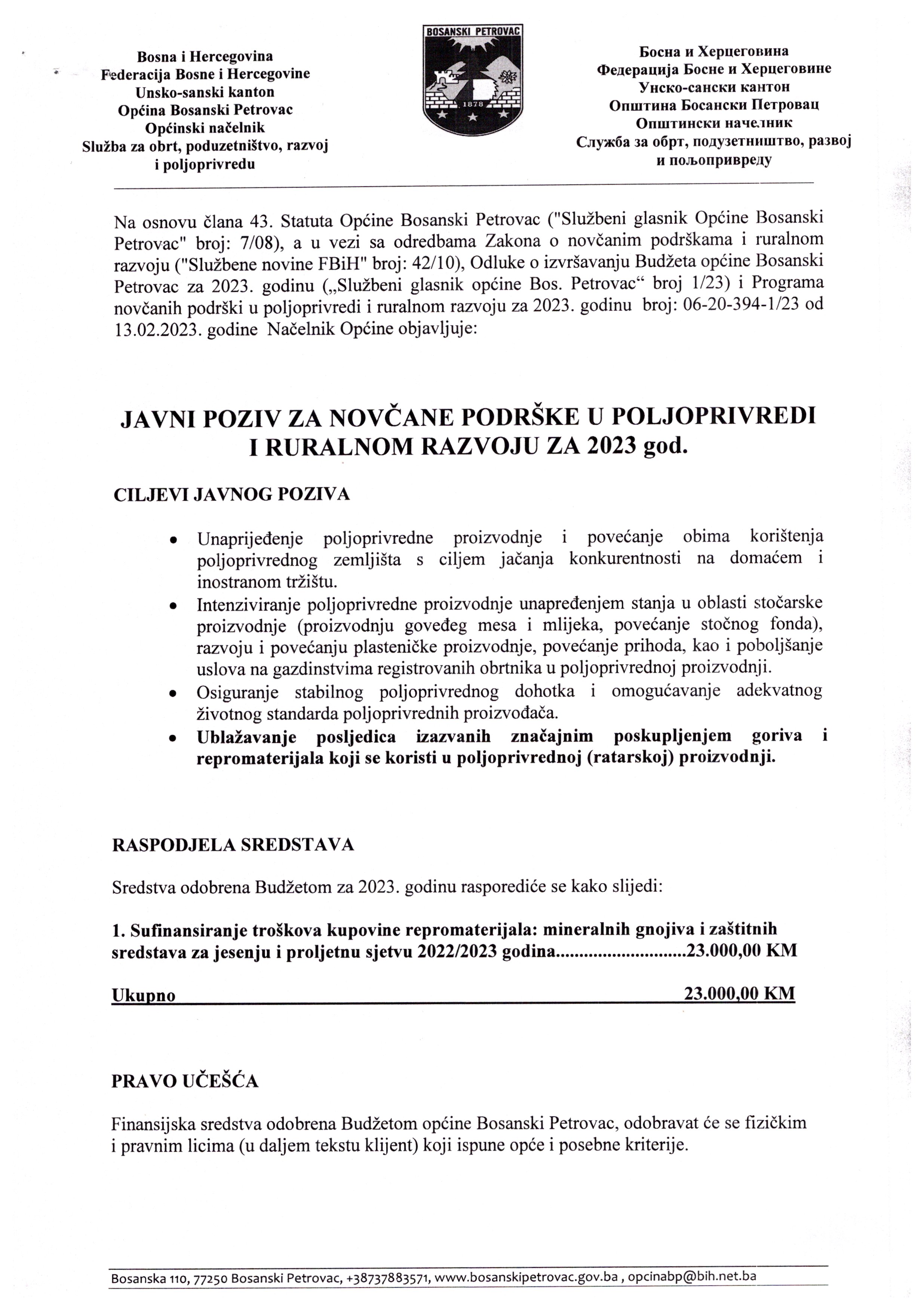Javni poziv za novčane podrške u poljoprivredi i ruralnom razvoju za 2023. godinu