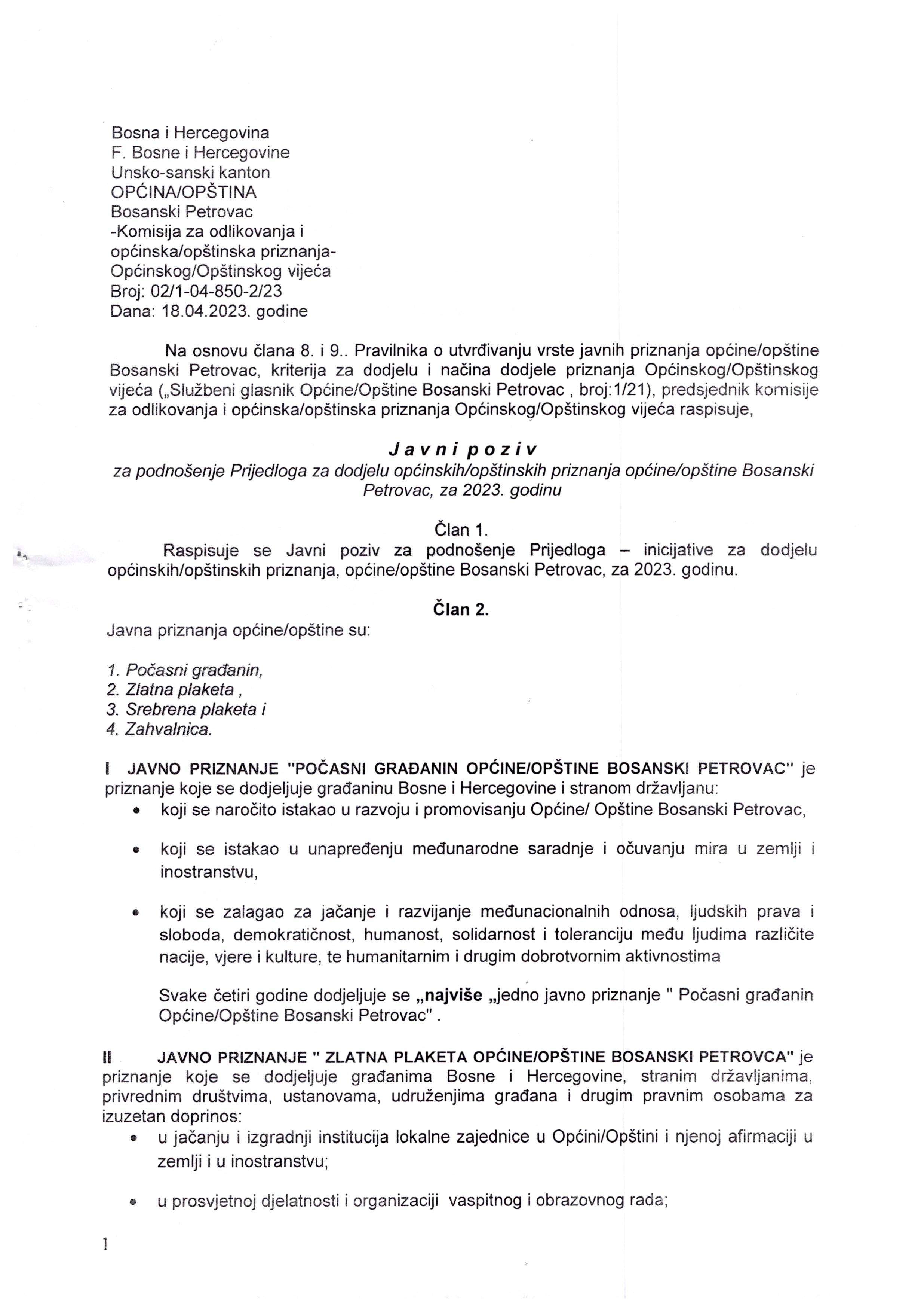 Javni poziv za podnošenje Prijedloga za dodjelu općinskih/opštinskih priznanja općine/opštine Bosanski Petrovac za 2023. godinu