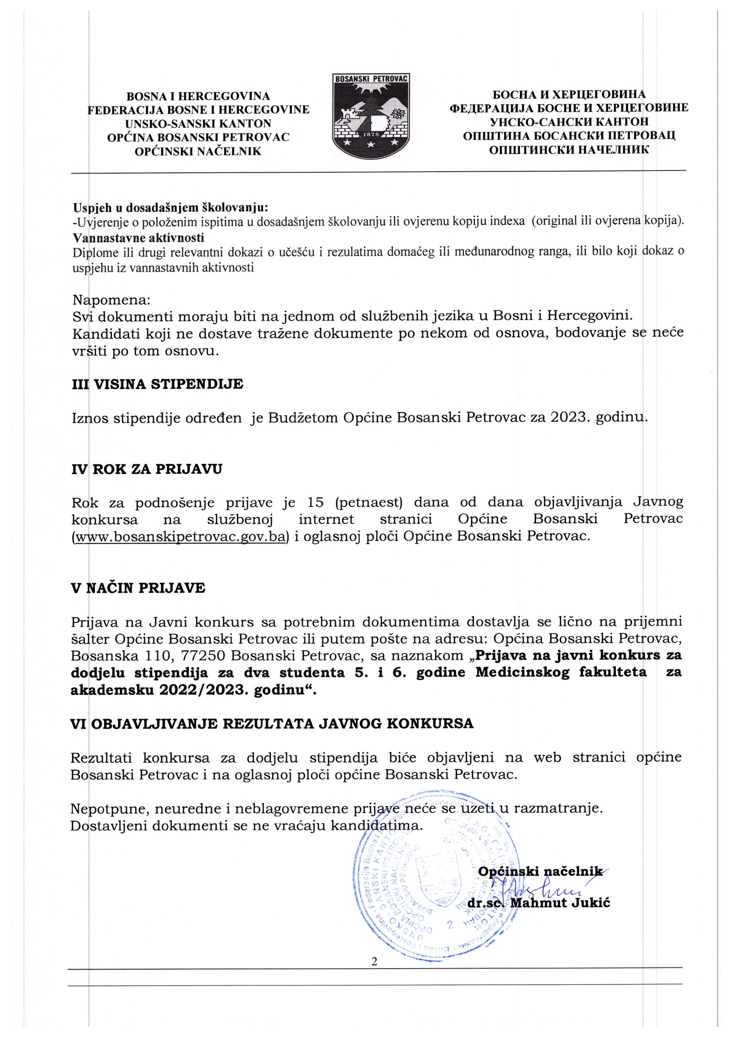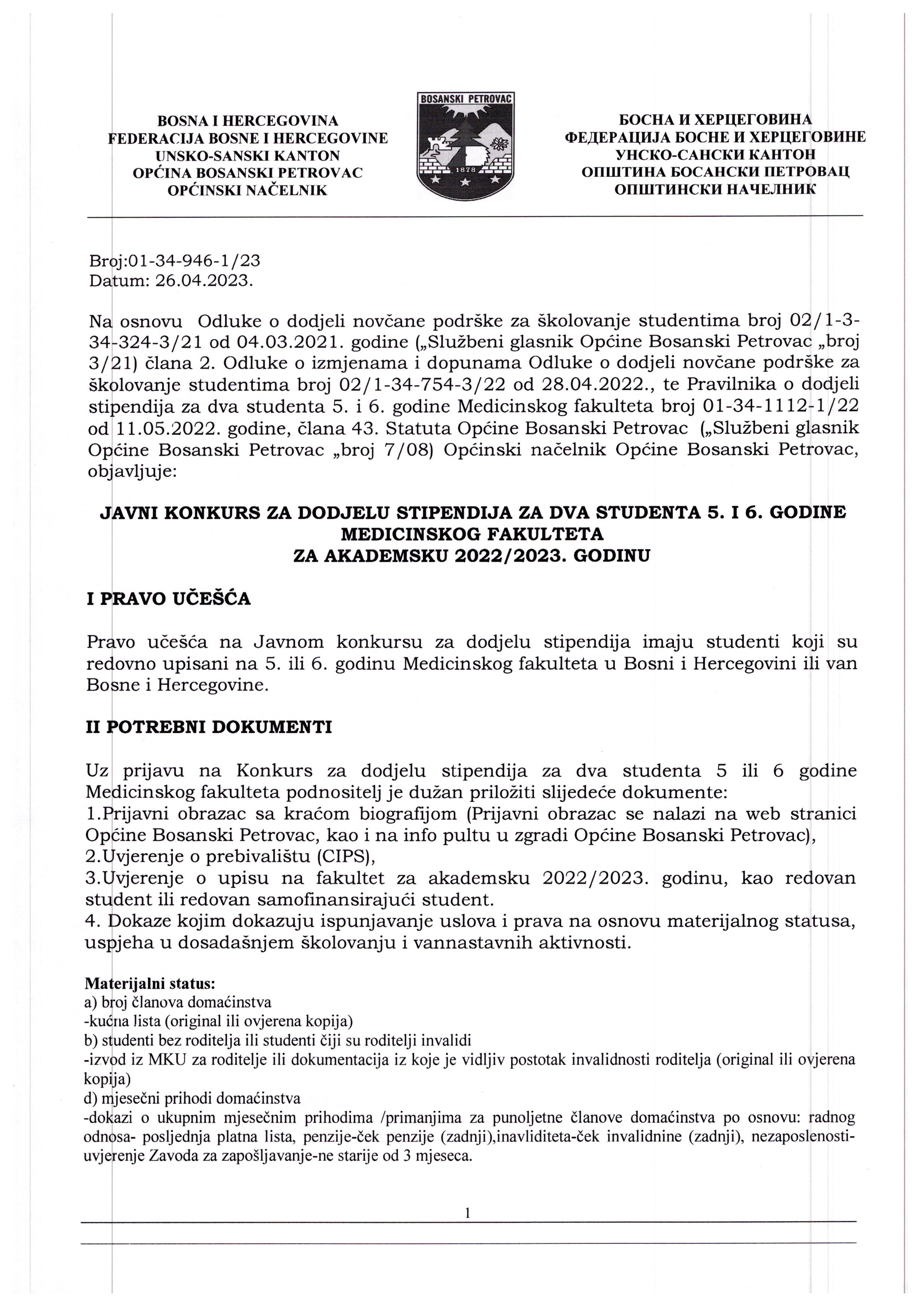 JAVNI KONKURS ZA DODJELU STIPENDIJA ZA DVA STUDENTA 5. I 6. GODINE MEDICINSKOG FAKULTETA ZA AKADEMSKU 2022/2023. GODINU