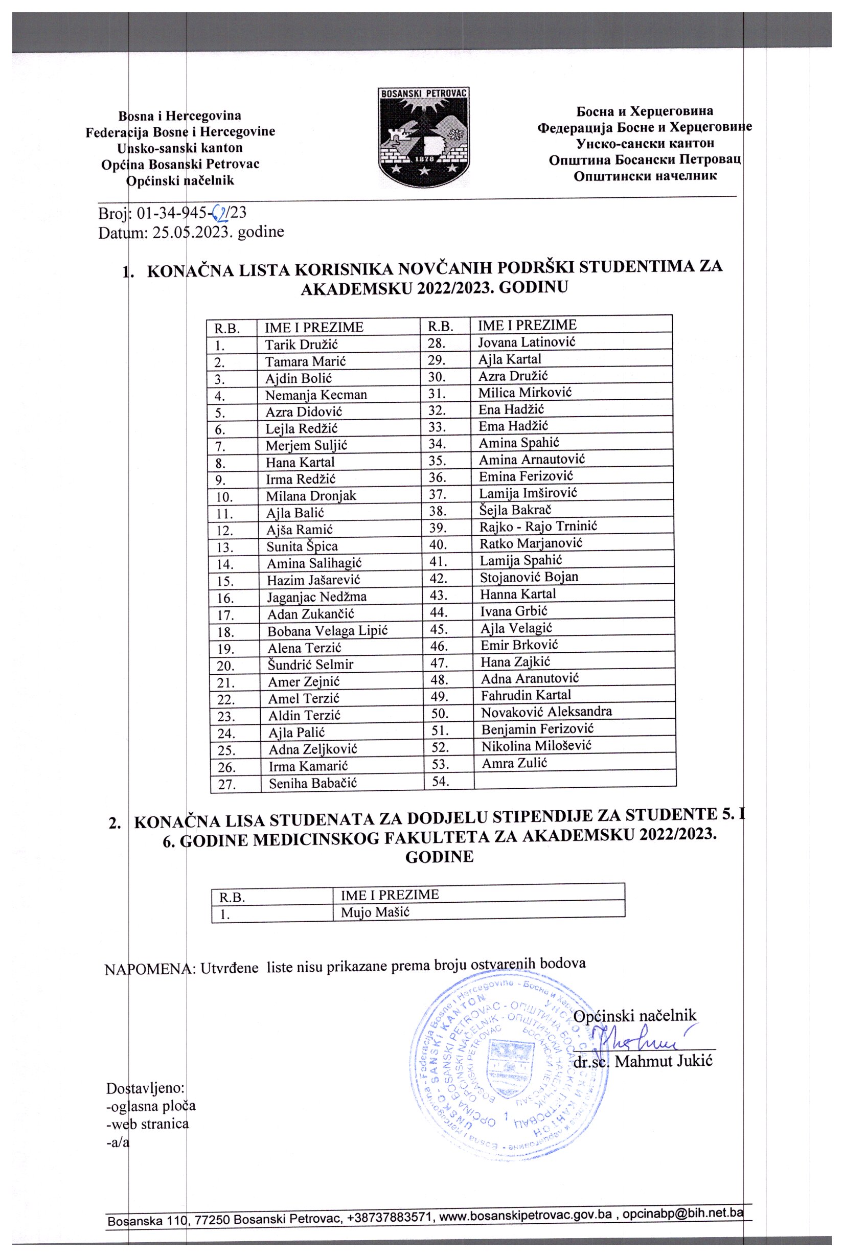 Konačna lista korisnika novčane podrške studentima i stipendije