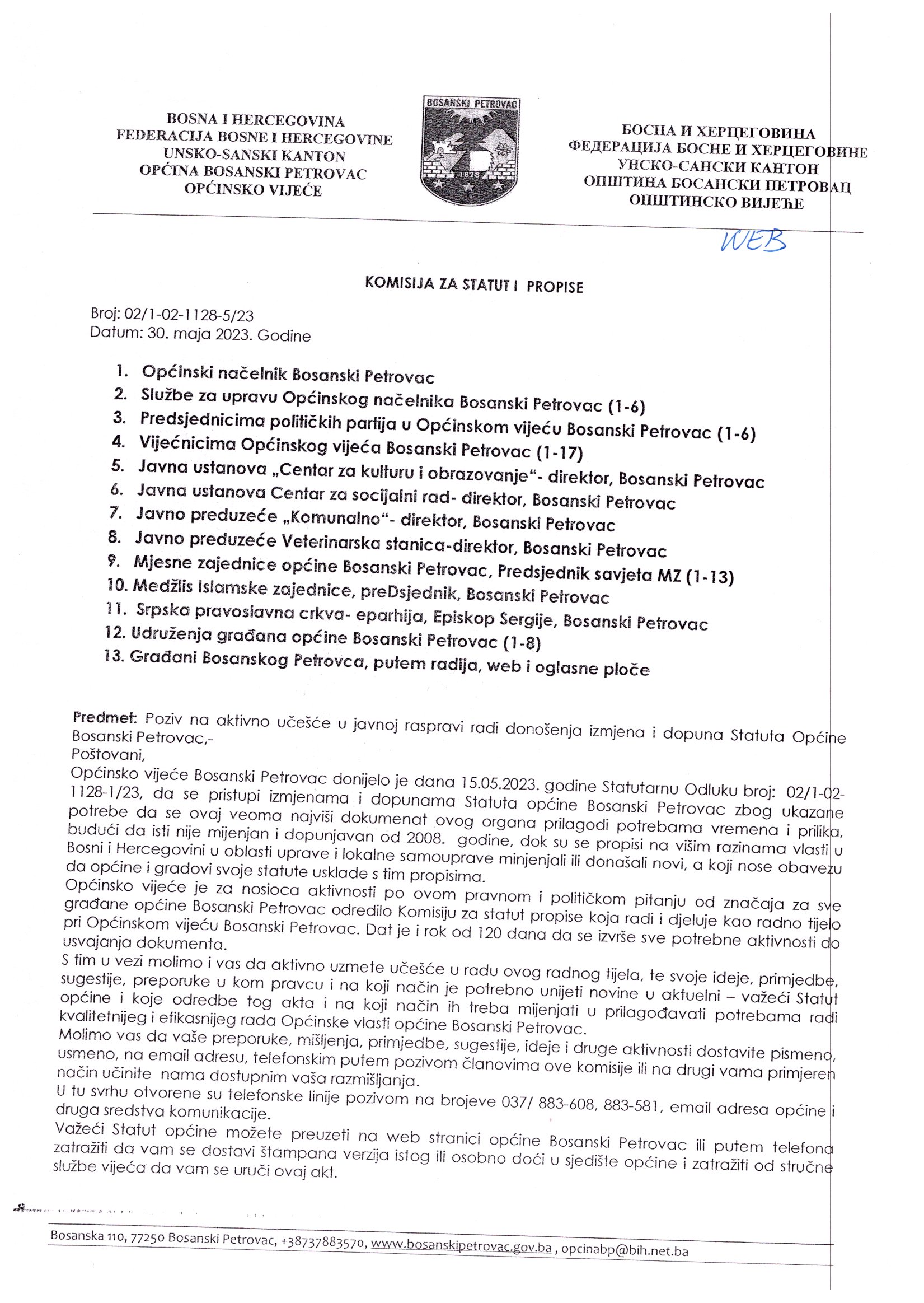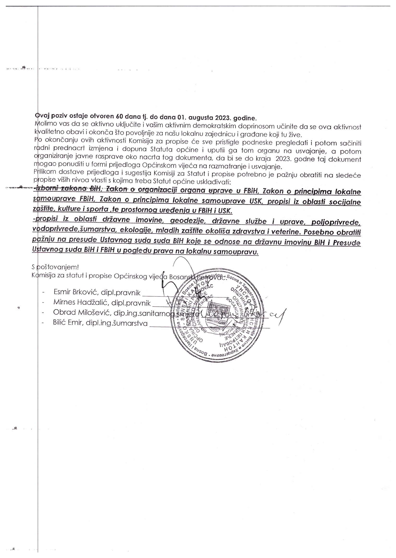 Poziv na aktivno učešće u javnoj raspravi radi donošenja izmjena i dopuna Statuta Općine Bosanski Petrovac