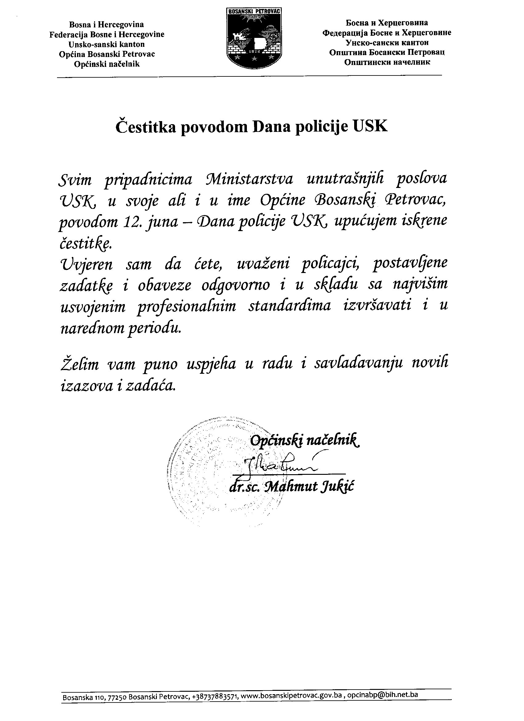 Čestitka povodom Dana policije USK-a