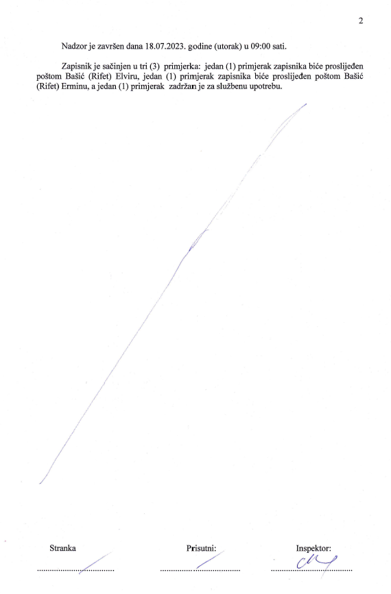 Zapisnik br. 07-19-5036-UP-1/23 od 18.07.2023. godine, dostavlja se na izjašnjenje Bašić (Rifet) Elvir i Bašić (Rifet) Ermin, komunalna inspekcija
