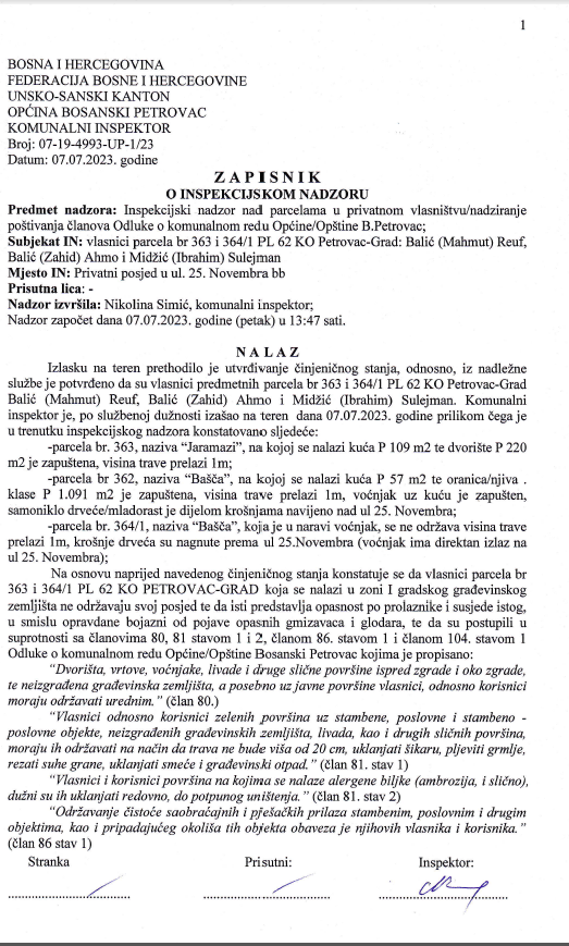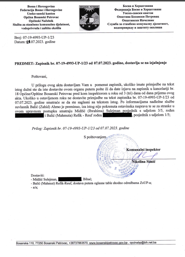 Zapisnik br. 07-19-4993-UP-1/23 od 07.07.2023. godine, dostavlja se na izjašnjenje Balić (Mahmut) Refik - Reuf, komunalna inspekcija