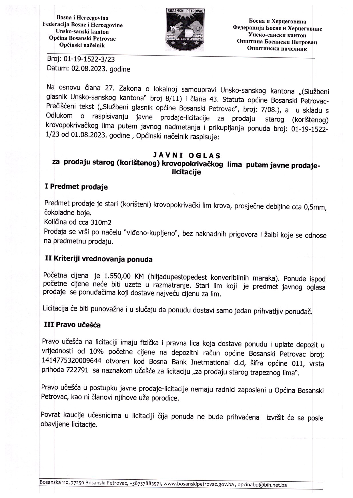 JAVNI OGLAS za prodaju putem javne prodaje - licitacije