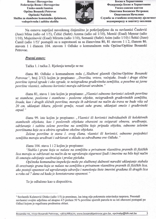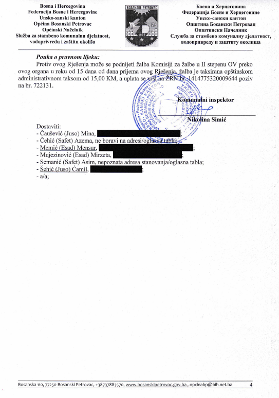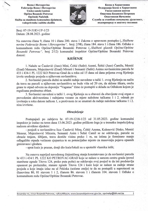 Rješenje br. 07-19-5183-UP-1/23 od 28.08.2023. godine dostavlja se Memić (Mensur) Esadu i Šehić (Juso) Ćamilu, komunalna inspekcija