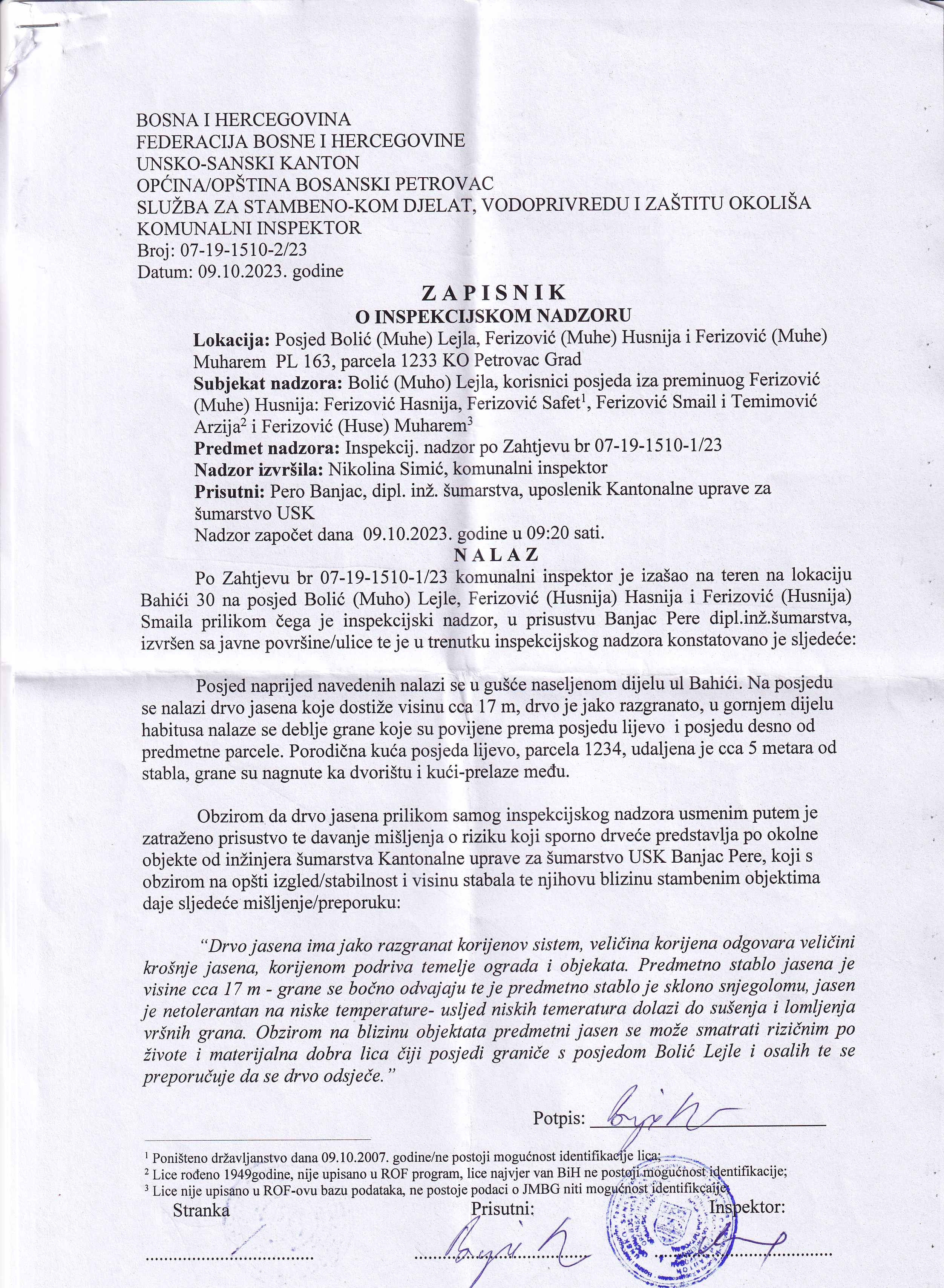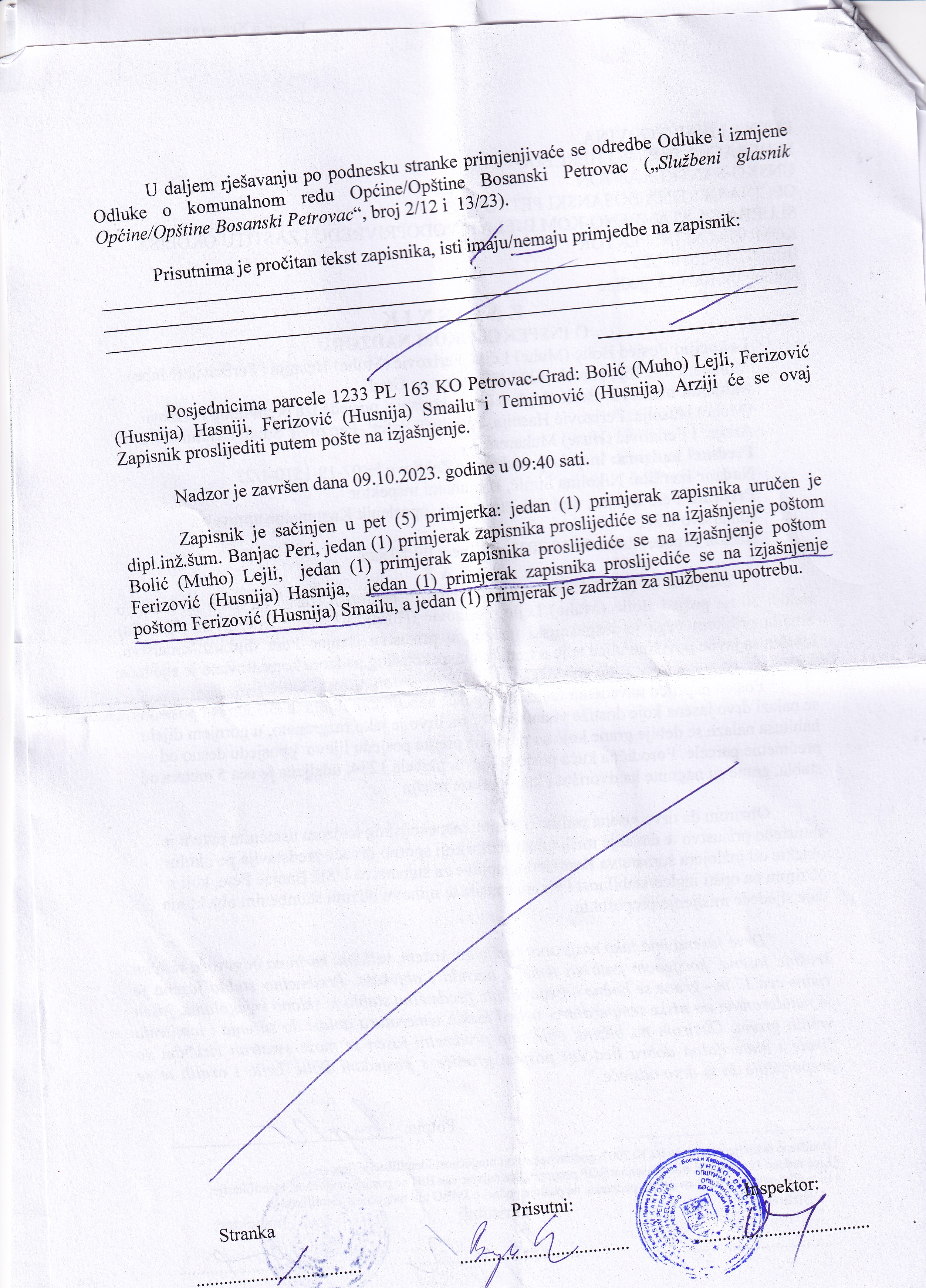ZAPISNIK BROJ 07-19-1510-2/23 OD 09.10.2023. GODINE DOSTAVLJA SE NA IZJAŠNJENJE FERIZOVIĆ (HUSNIJE) SMAILU, KOMUNALNA INSPEKCIJA