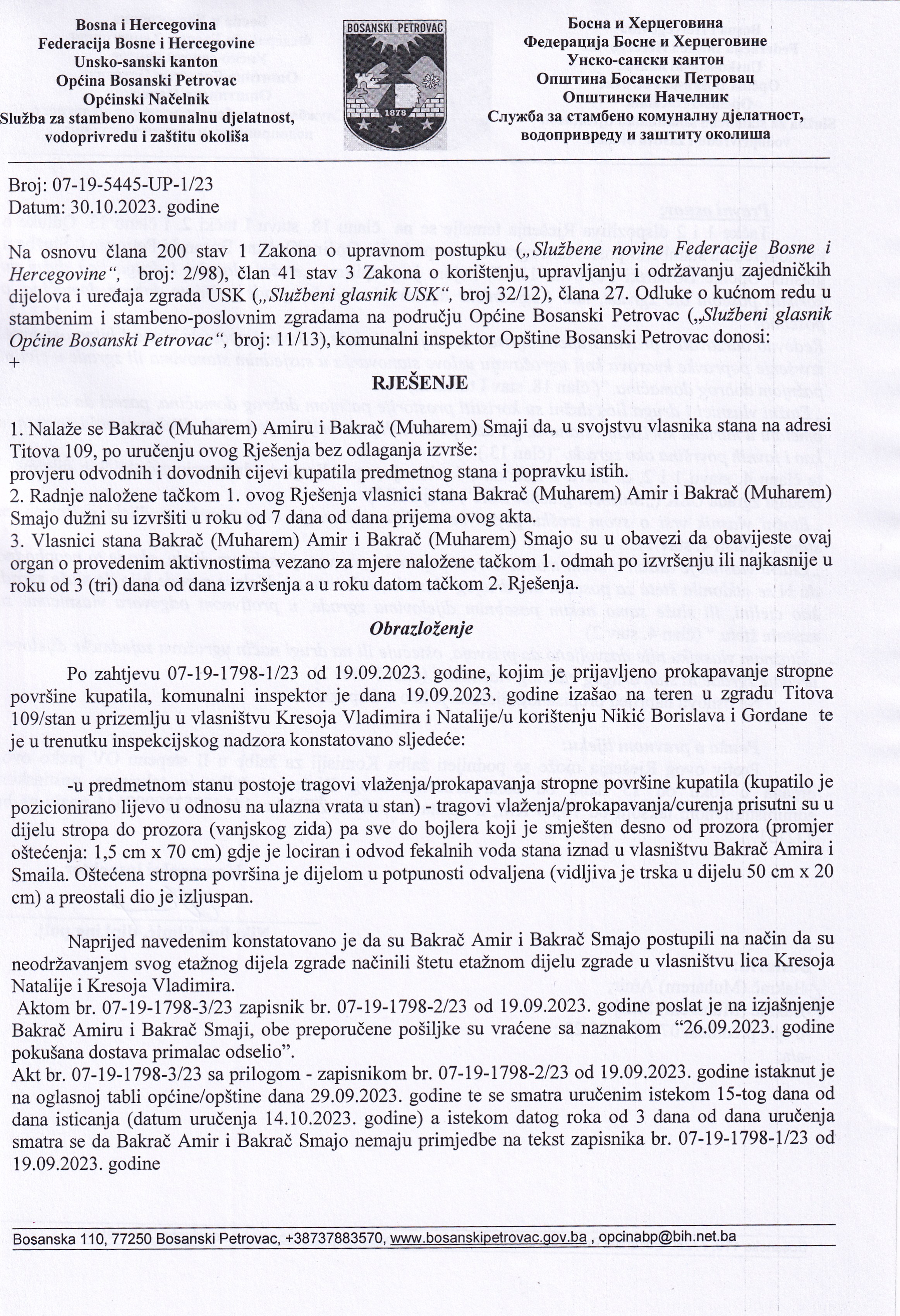Rješenje Bakrač (Muharem) Amir i Bakrač (Muharem) Smajo, komunalna inspekcija