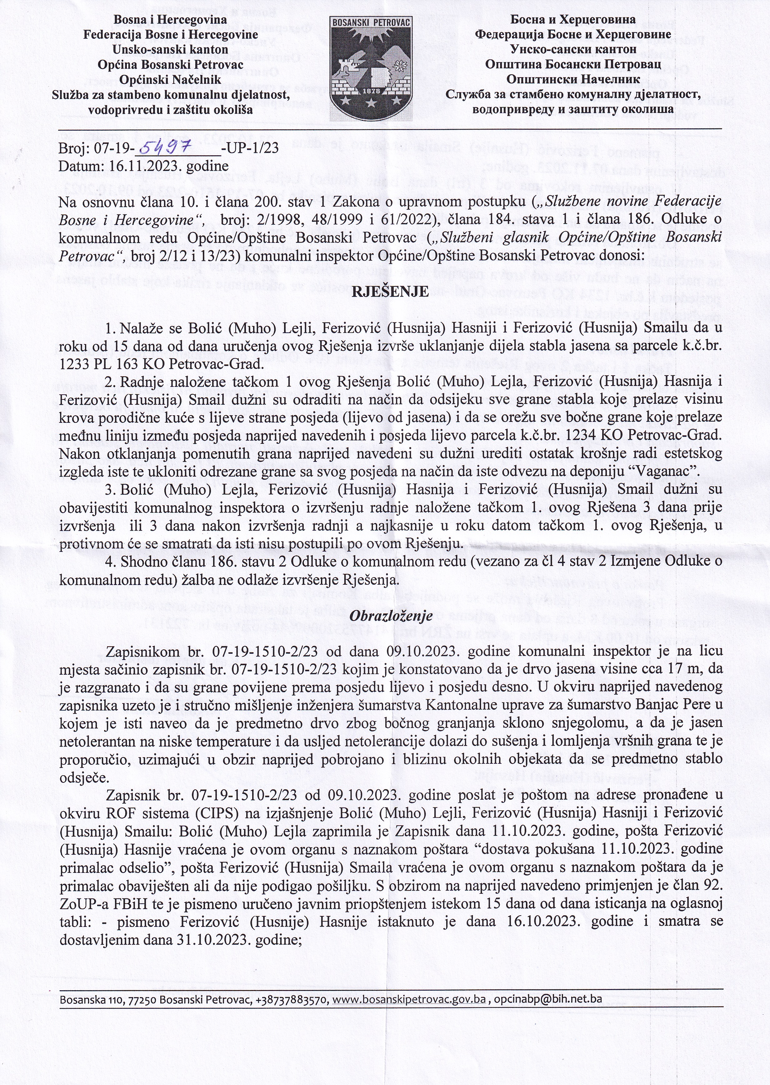 RJEŠENJE BR. 07-19-5497-UP-1/23 DOSTAVLJA SE BOLIĆ (MUHO) LEJLI, KOMUNALNA INSPEKCIJA