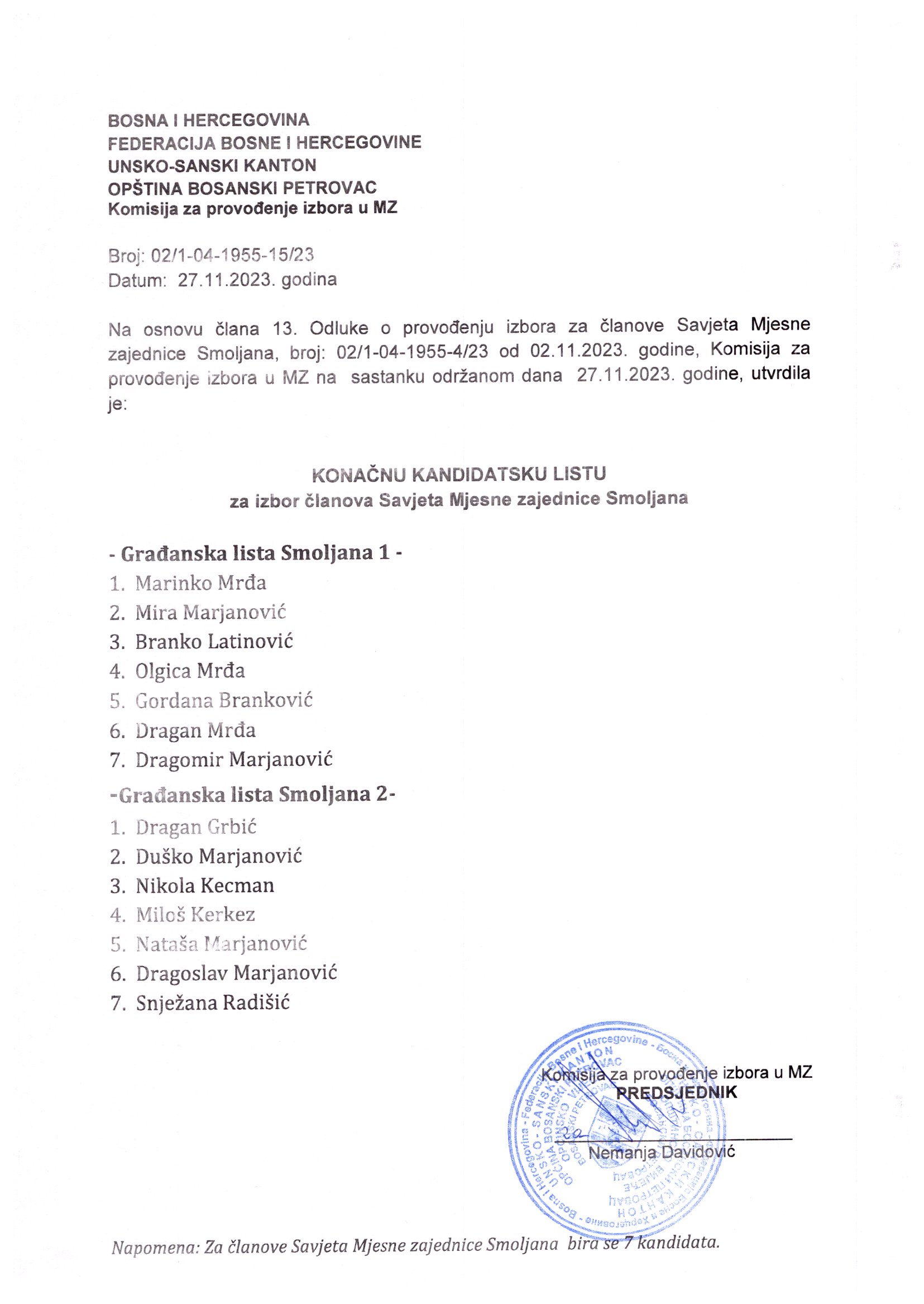 KONAČNA KANDIDATSKA LISTA ZA IZBORE ČLANOVA SAVJETA MJESNE ZAJEDNICE SMOLJANA