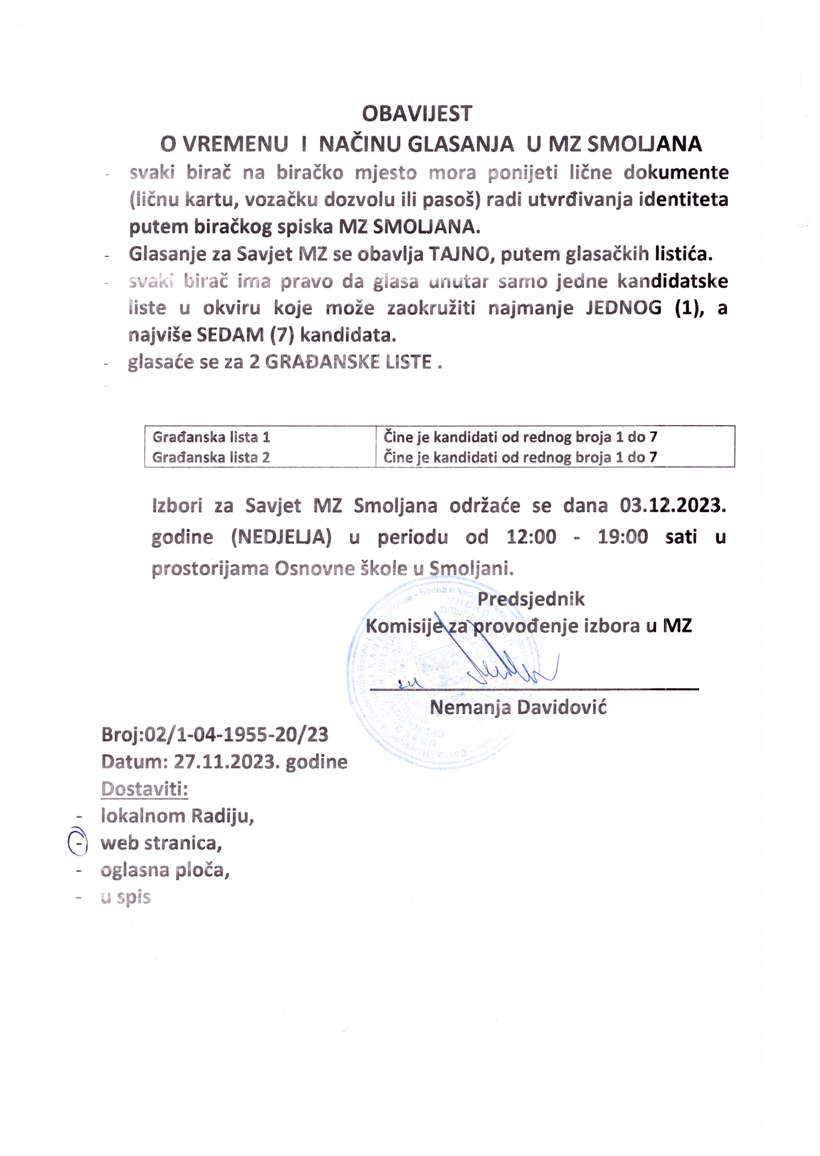 OBAVIJEST O VREMENU I NAČINU GLASANJA U MZ SMOLJANA