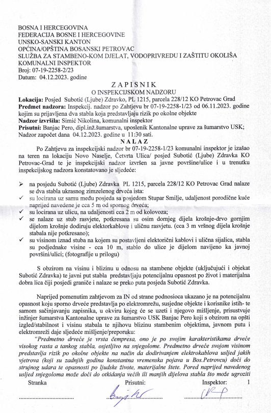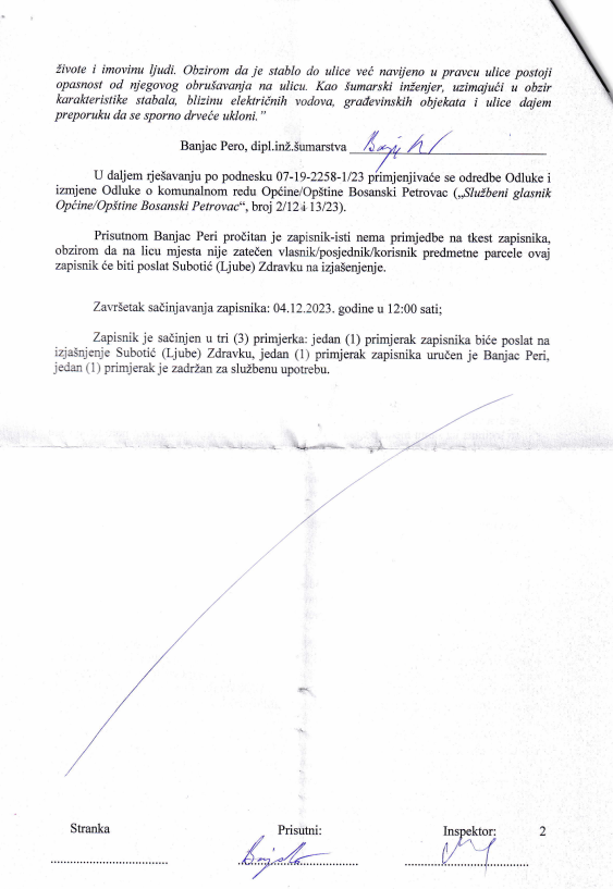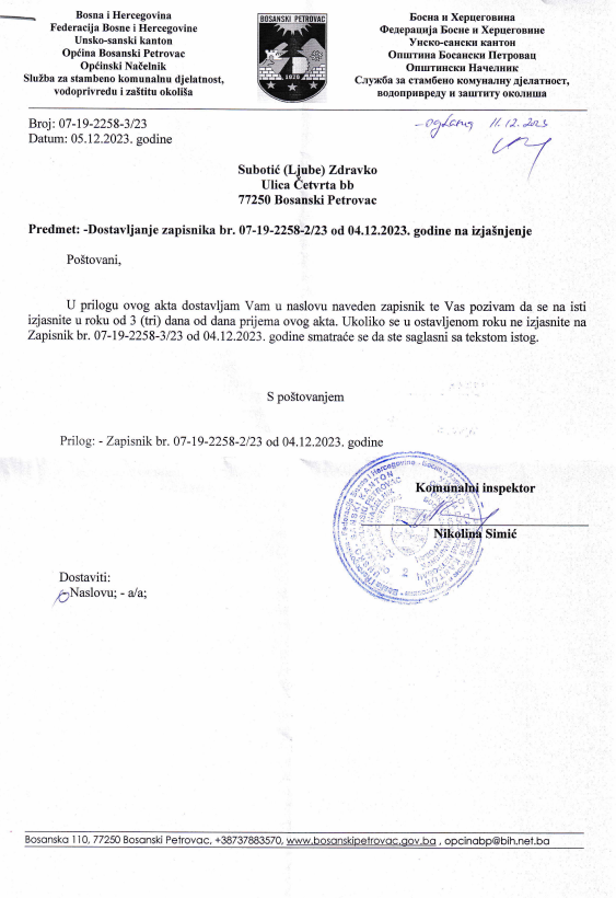 "Zapisnik br. 07-19-2258-2/23 od 04.12.2023. godine dostavlja se na izjašnjenje Subotić Zdravku, komunalna inspekcija"