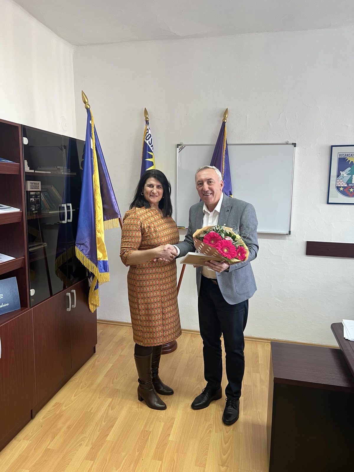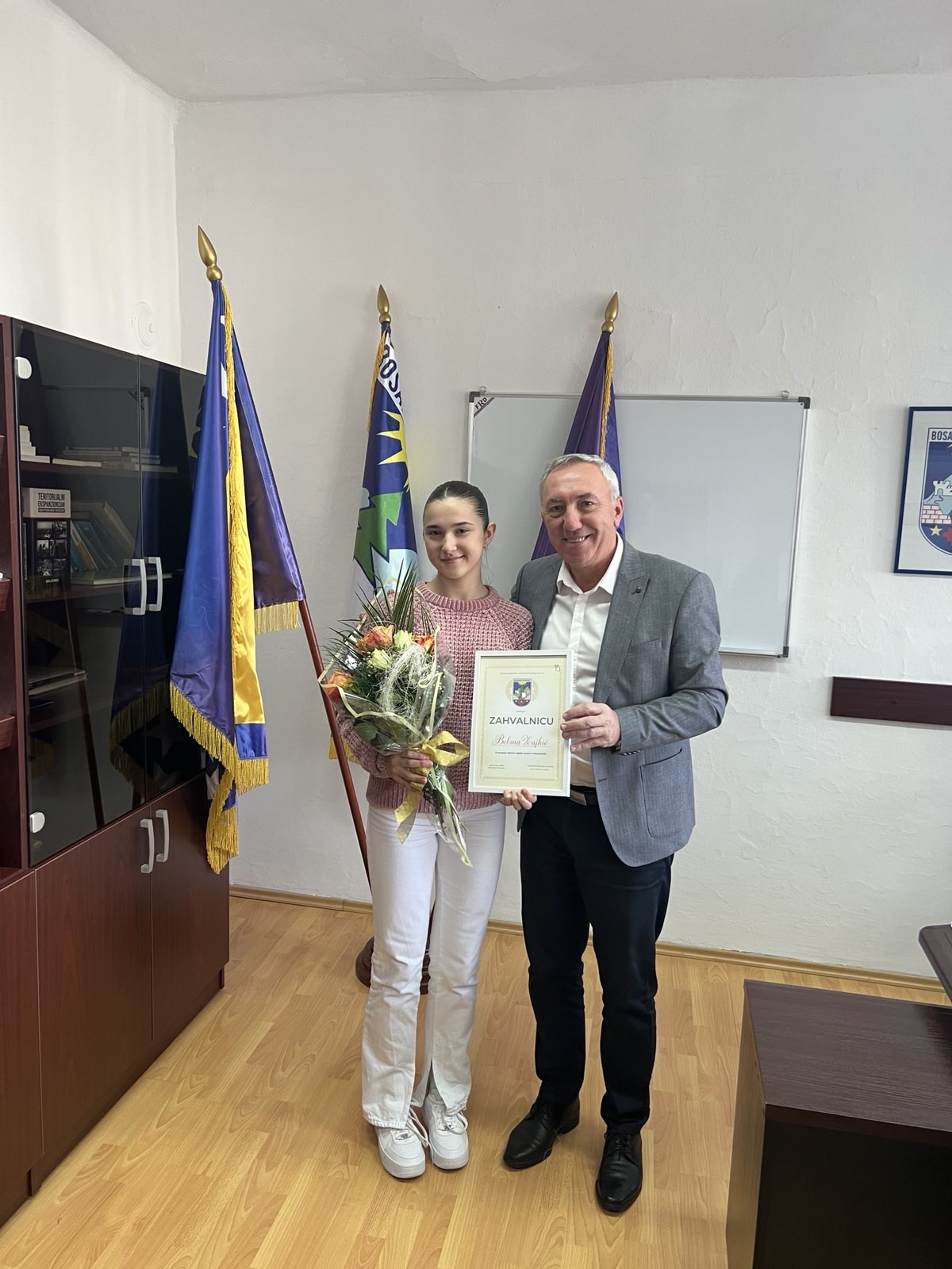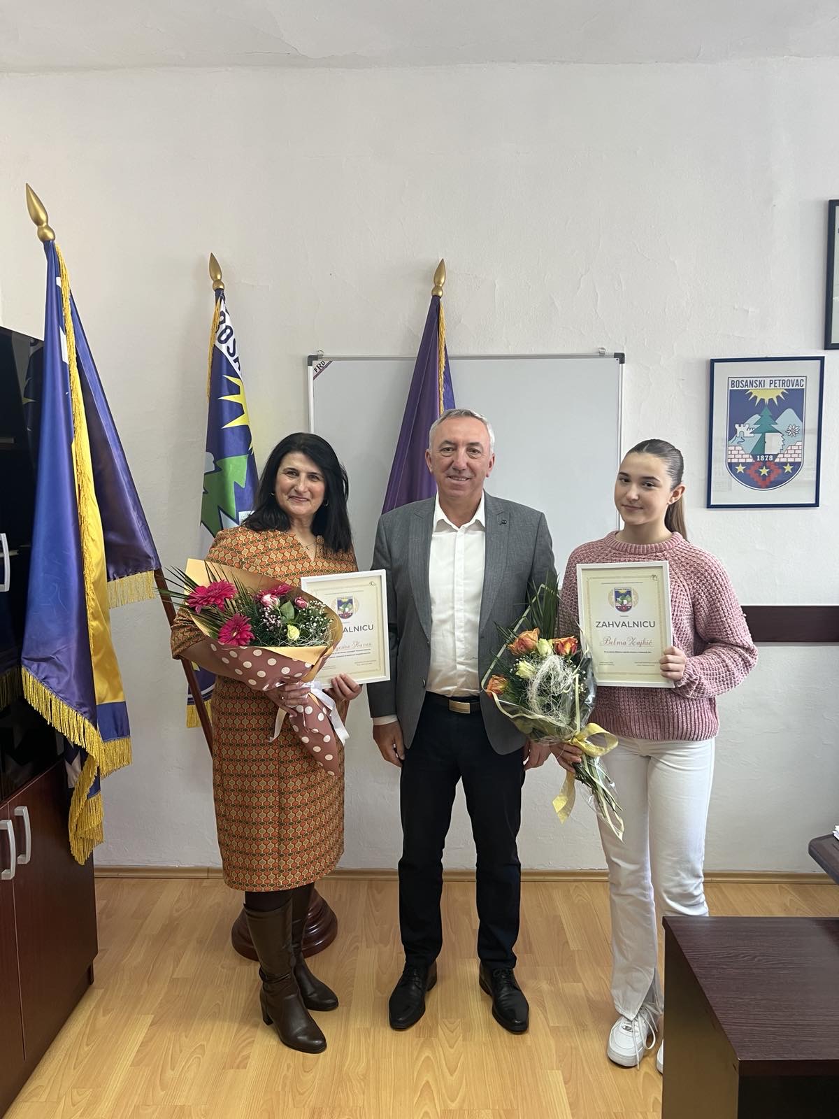 Federalno ministarstvo obrazovanja i nauke prije nekoliko dana na tradicionalnoj manifestaciji uručilo je diplome najboljim učenicima u Federaciji BiH. Jedna od dobitnica nagrade je i Belma Zajkić, bivša učenica OŠ “Ahmet Hromadžić”, a trenutno učenica MSŠ “Bosanski Petrovac”. Pored Belme, priznanje je uručeno i direktorici škole Mujesiri Kavaz za podstrek učenicima u postizanju vrhunskih rezultata. Načelnik općine Bosanski Petrovac gospodin Mahmut Jukić danas je upriličio prijem za Belmu i direktoricu gospođu Mujesiru Kavaz, ovo je bila prilika da se razgovara o dosadašnjoj saradnji, te da se gošćama uruči zahvalnica za veliki uspjeh.