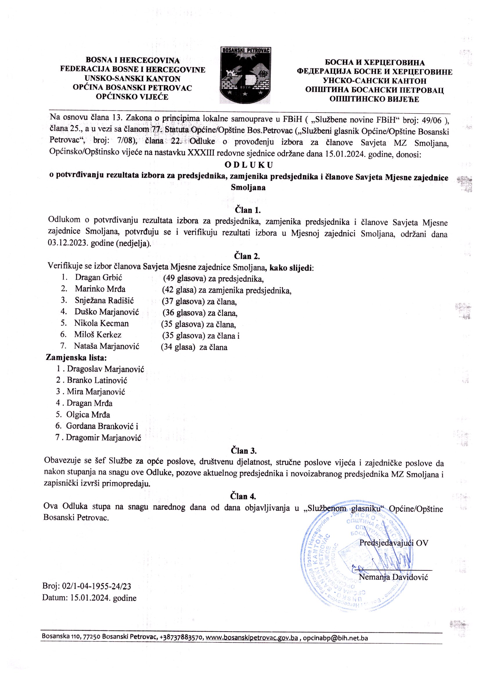 Odluka o potvrđivanju rezultata izbora provedenih u MZ Smoljana