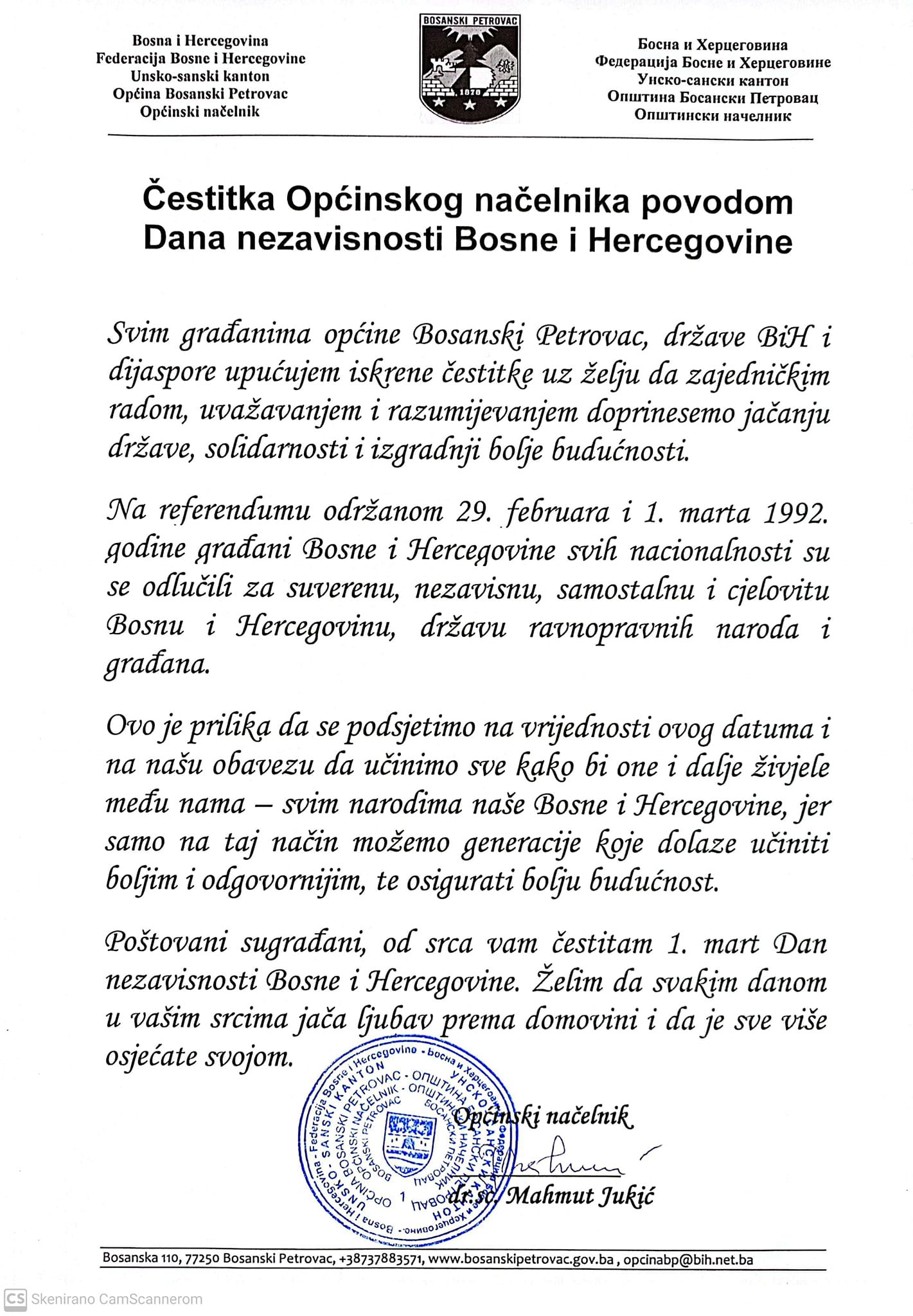 Čestitka Općinskog načelnika povodom Dana nezavisnosti Bosne i Hercegovine