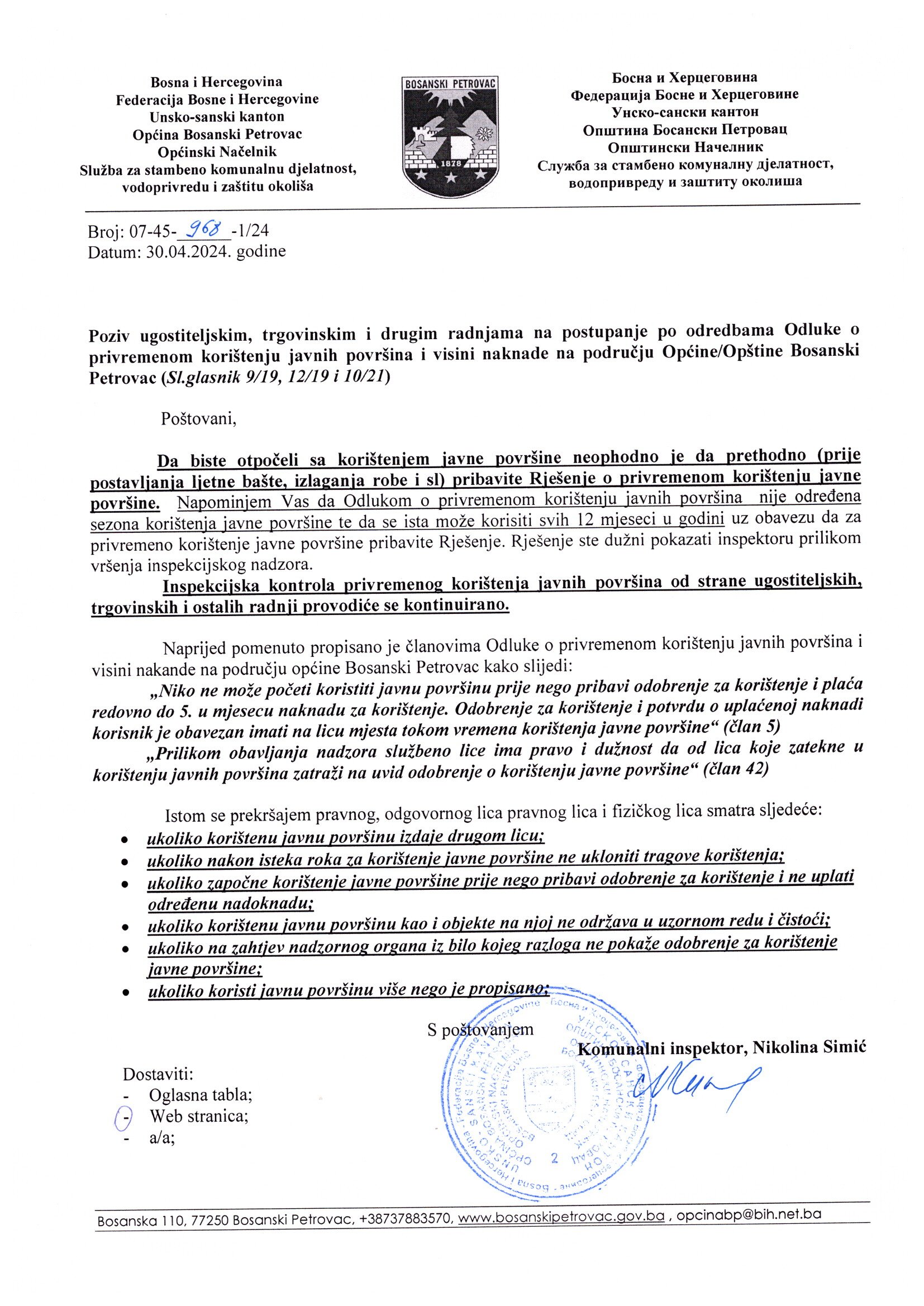 Poziv ugostiteljskim, trgovinskim i drugim radnjama, komunalni inspektor