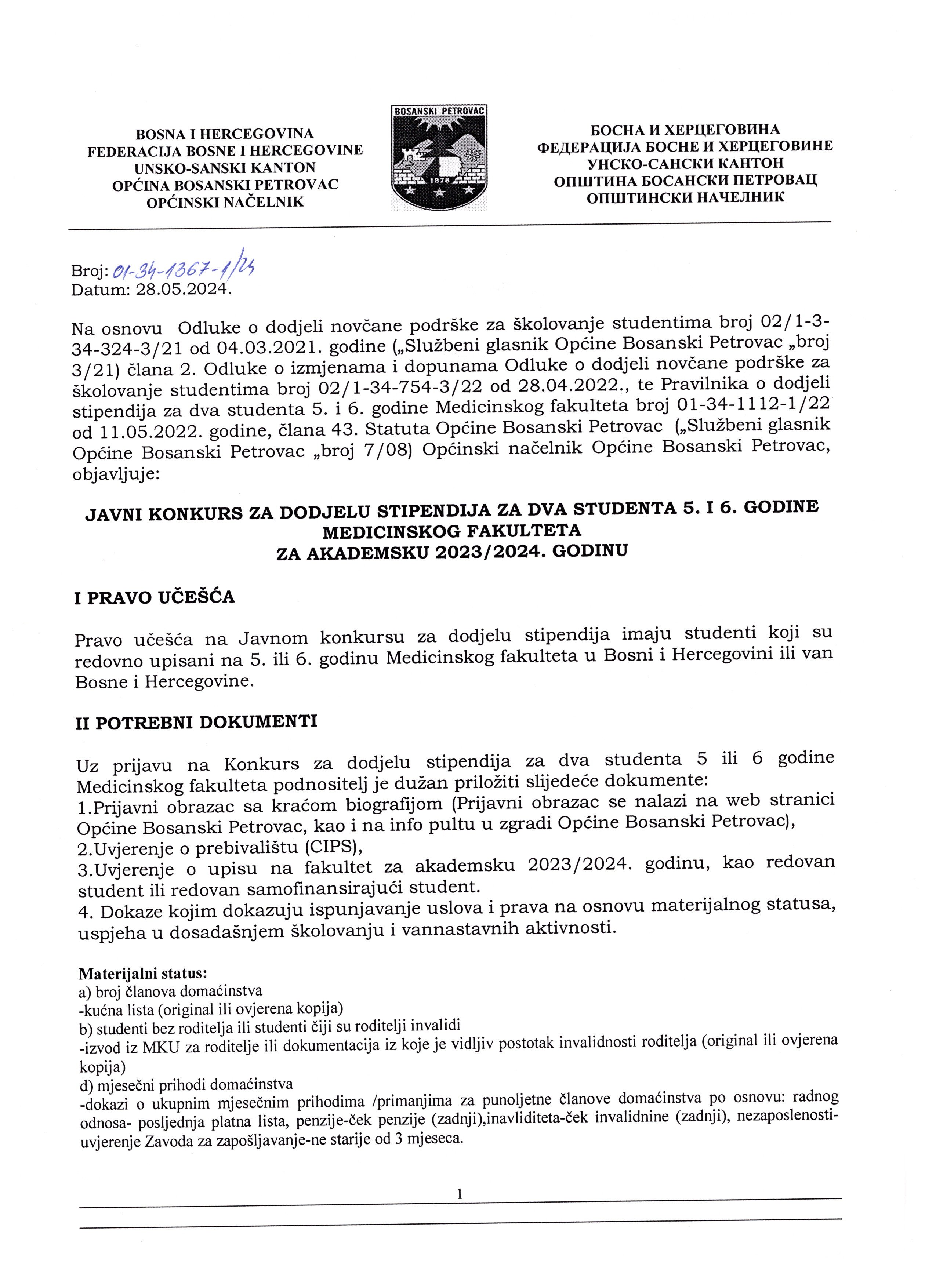 JAVNI KONKURS ZA DODJELU STIPENDIJA ZA DVA STUDENTA 5. I 6. GODINE MEDICINSKOG FAKULTETA ZA AKADEMSKU 2023/2024. GODINU