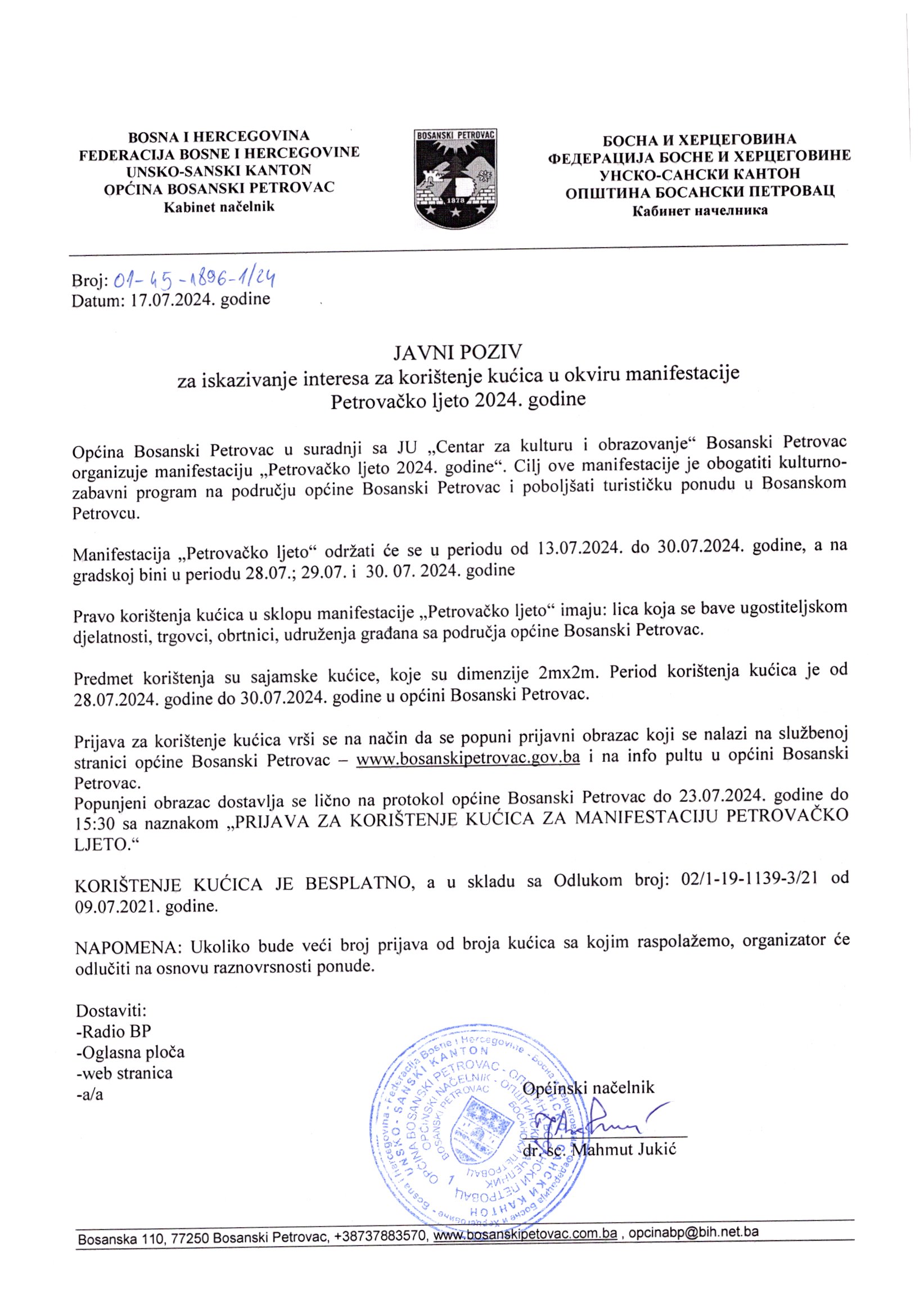 JAVNI POZIV za iskazivanje interesa za korištenje kućica u okviru manifestacije Petrovačko ljeto 2024. godine