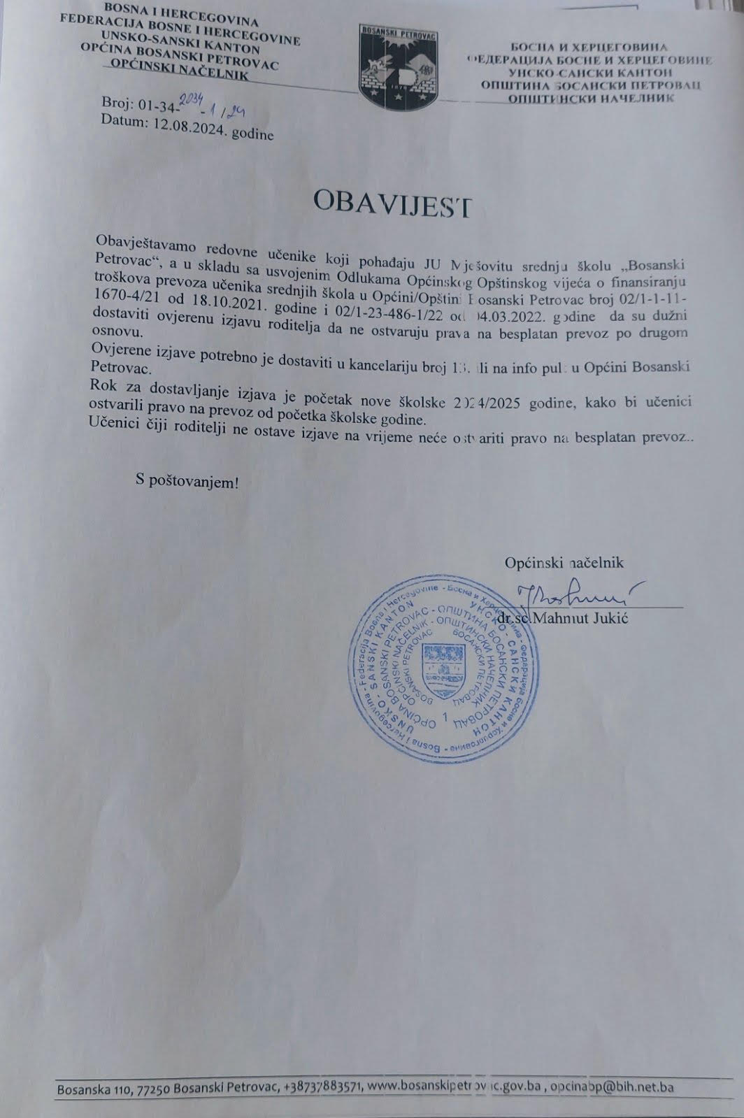 OBAVIJEST UČENICIMA SREDNJE ŠKOLE - PREVOZ