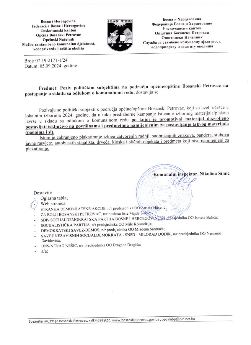 Poziv političkim subjektima na području općine/opštine Bosanski Petrovac