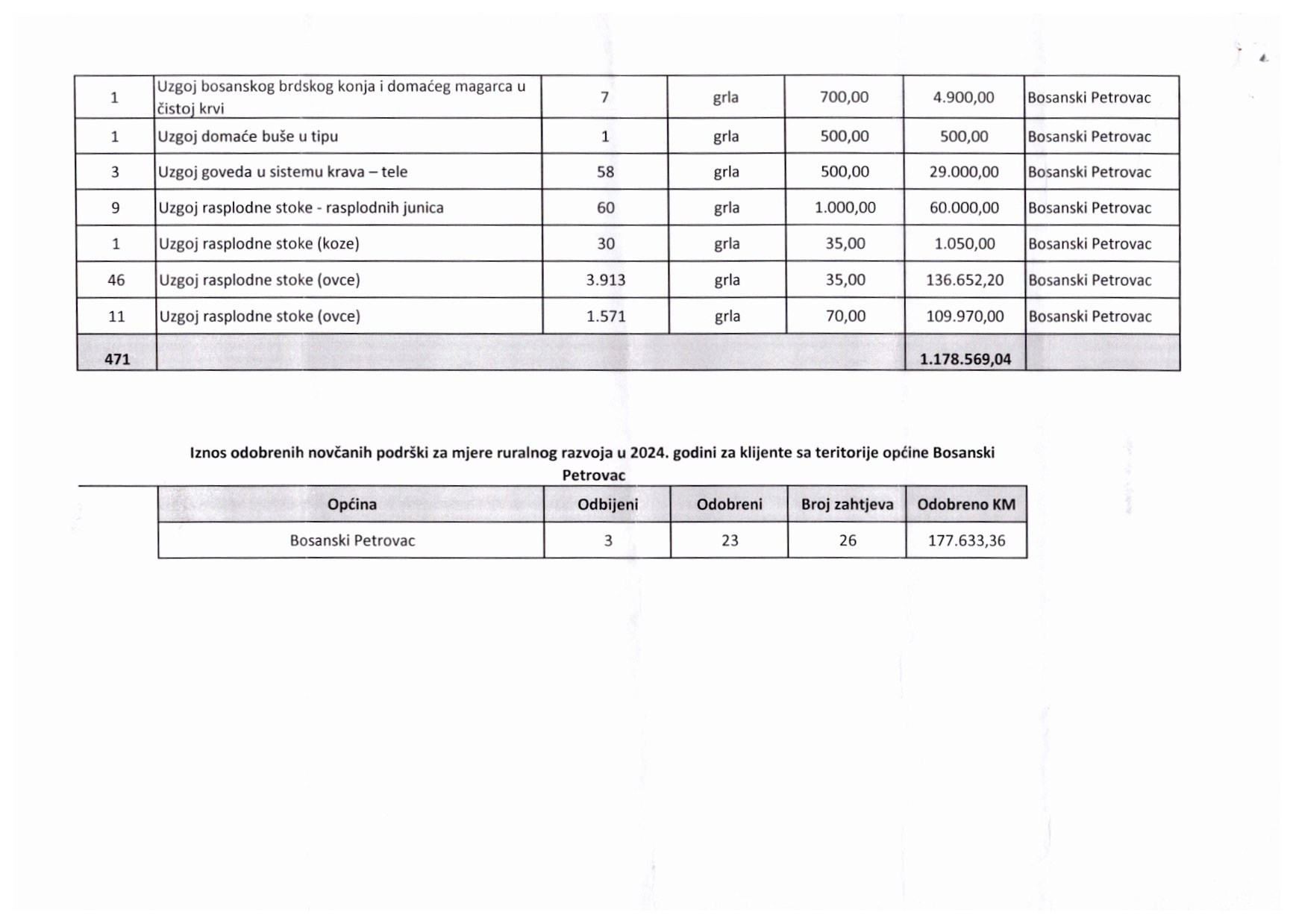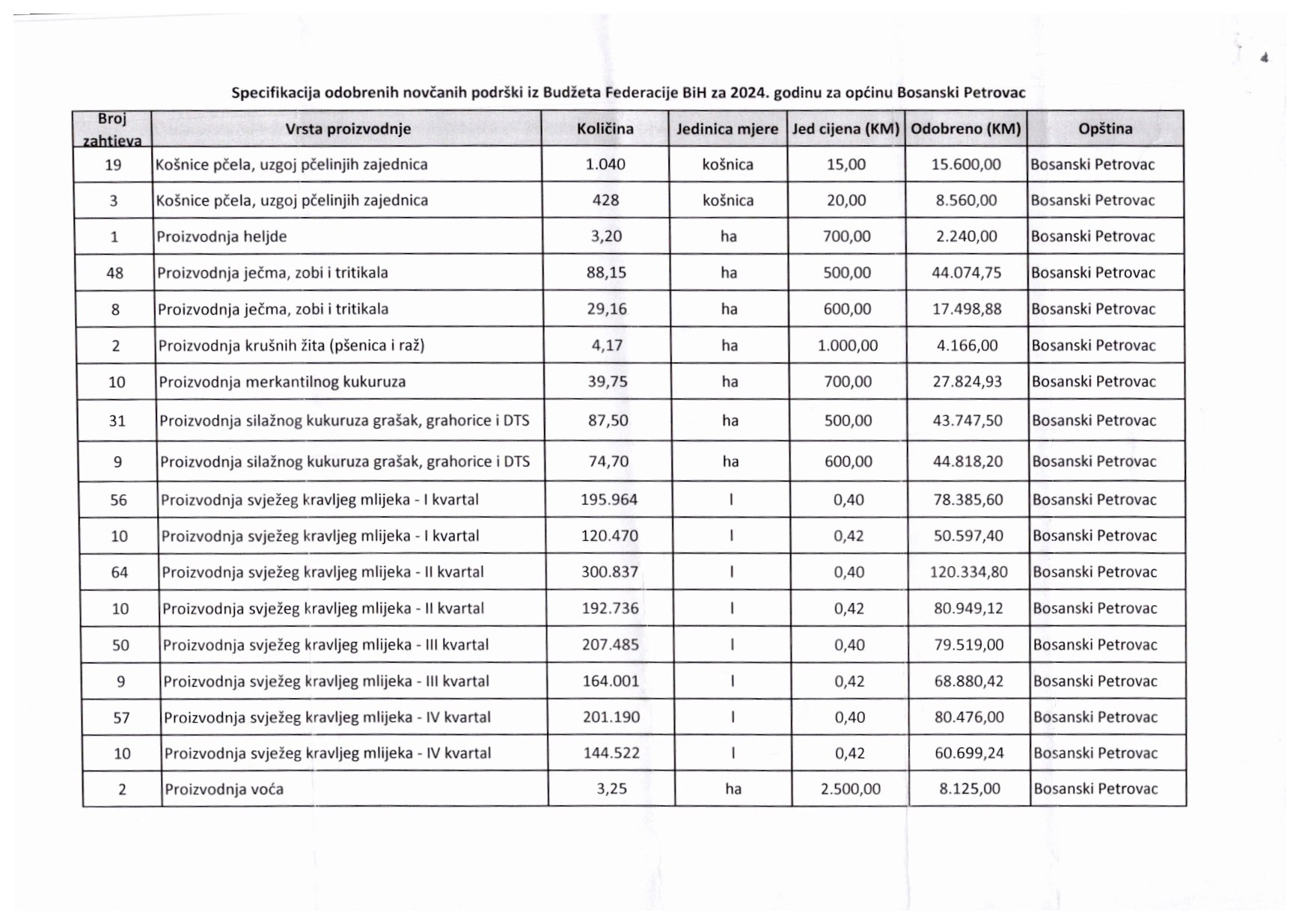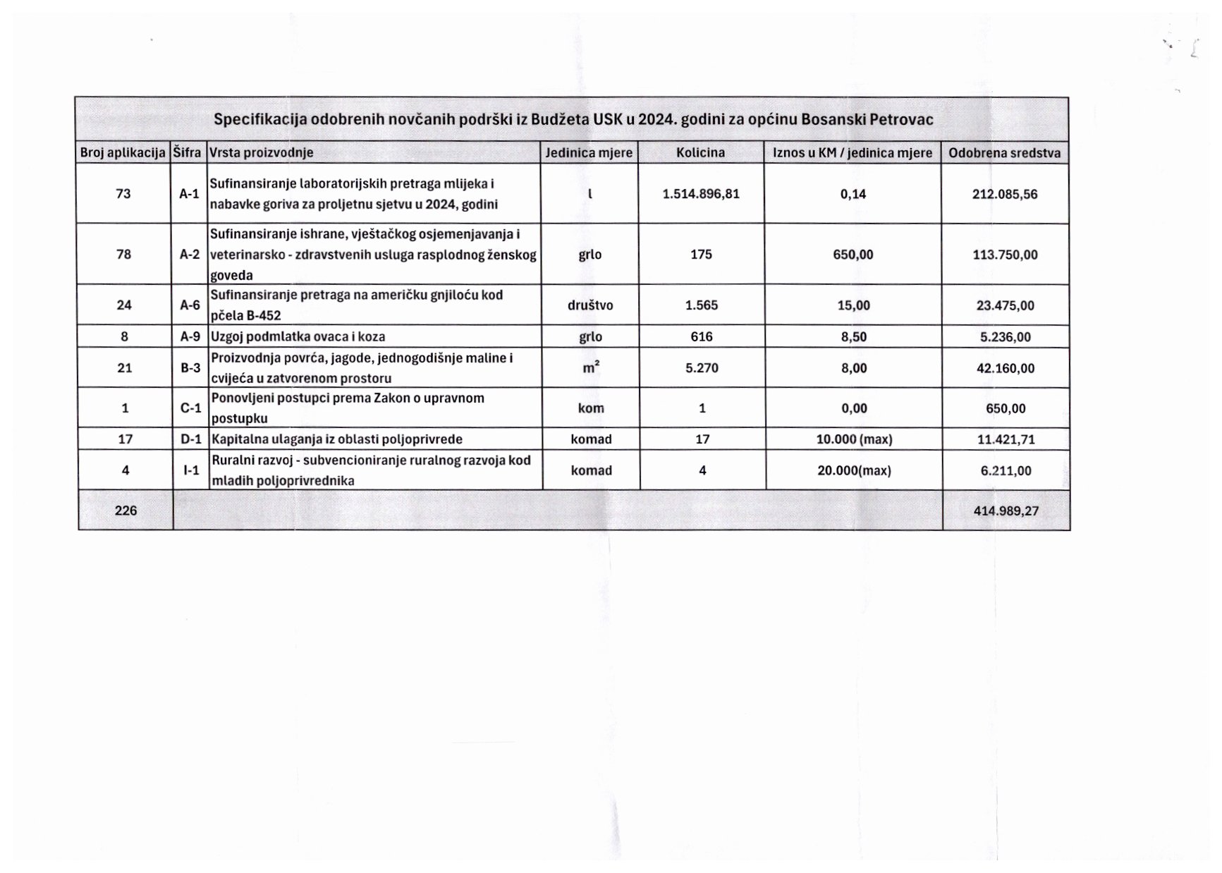 Informacija o ostvarenim novčanim podrškama za poljoprivrednu proizvodnju iz Budžeta FBiH i USK-a