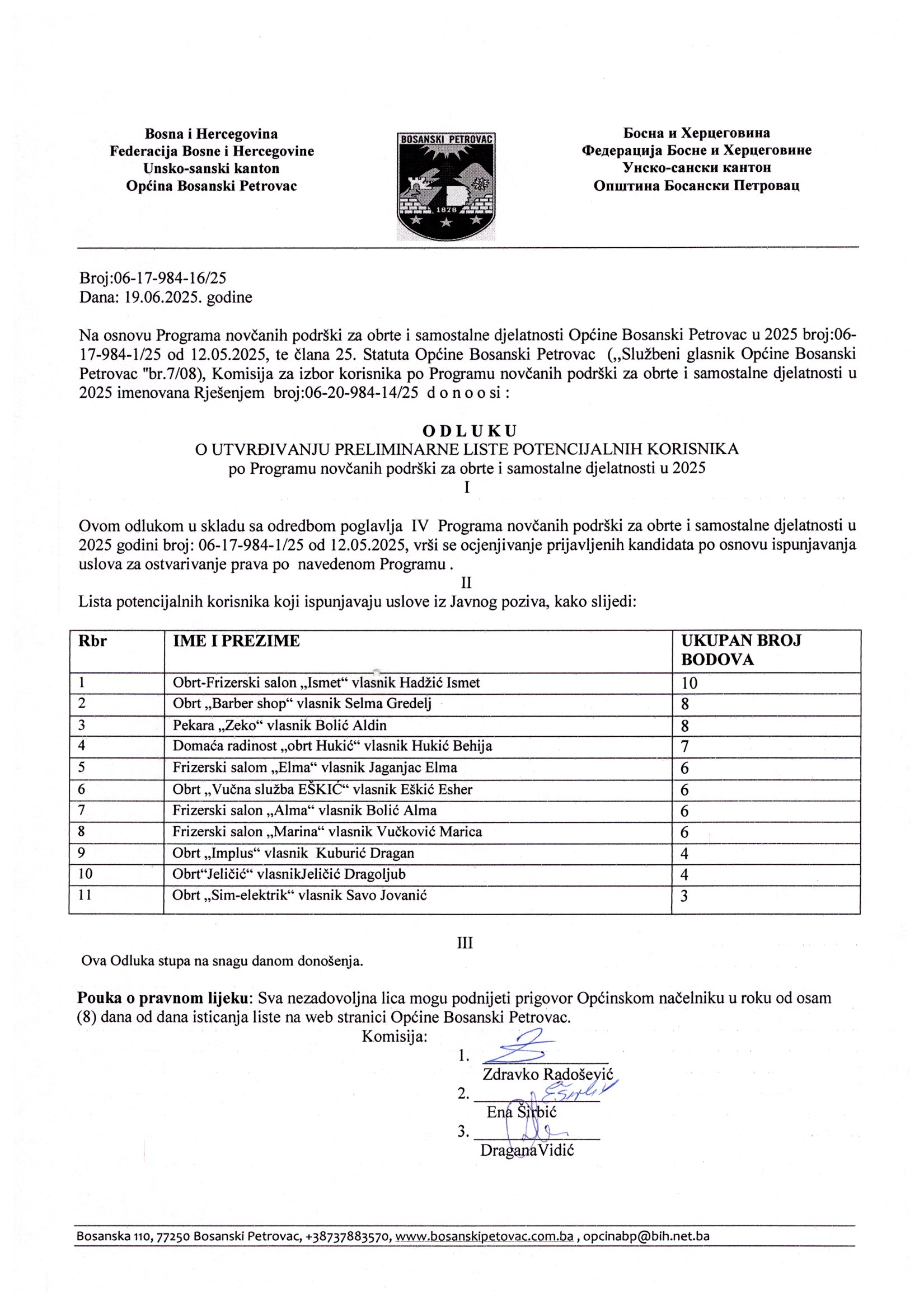 PRELIMINARNA LISTA POTENCIJALNIH KORISNIKA PO PROGRAMU NOVČANIH PODRŠKI ZA OBRTE I SAMOSTALNE DJELATNOSTI U 2025.