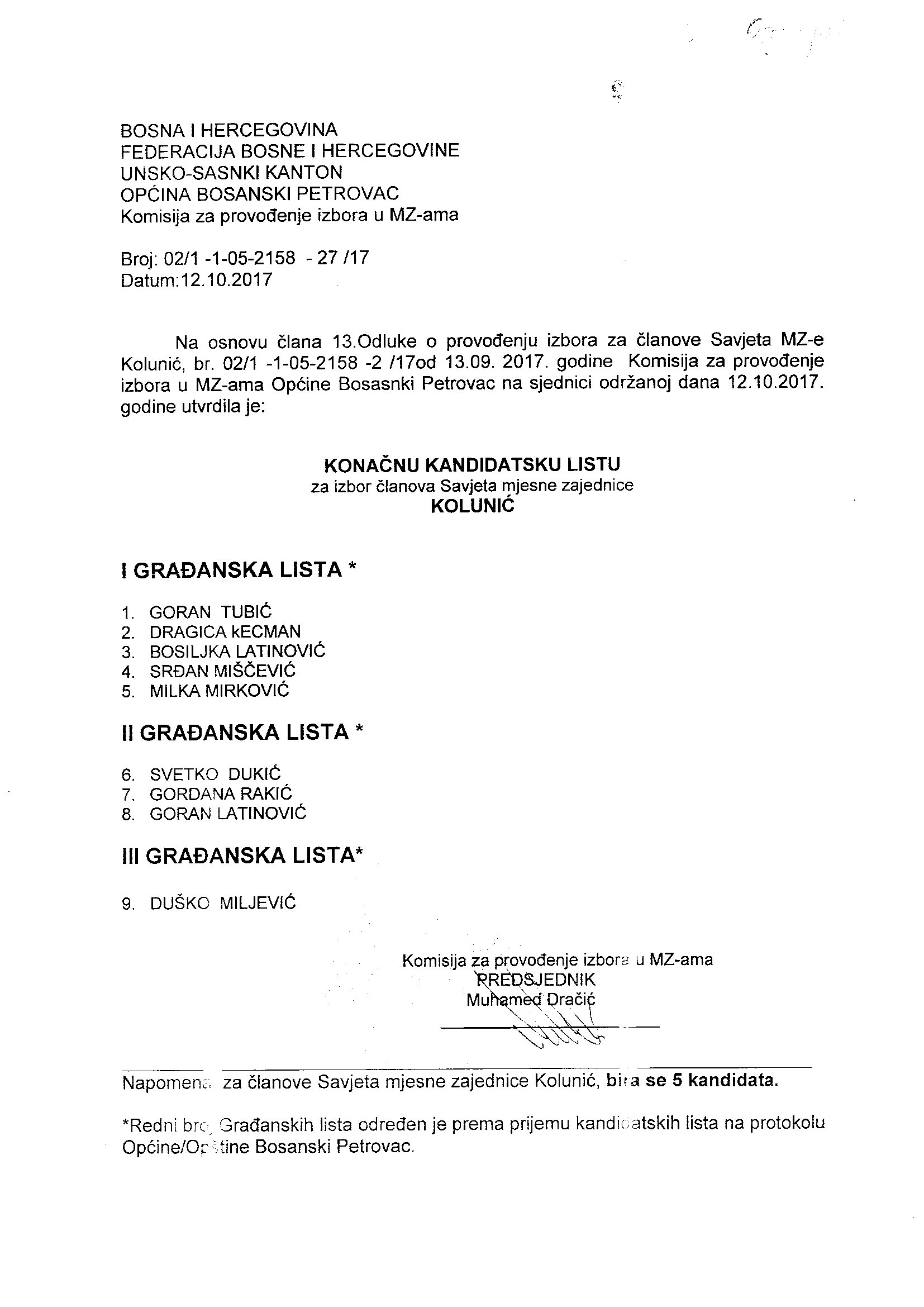 Kandidatska lista, MZ Kolunić