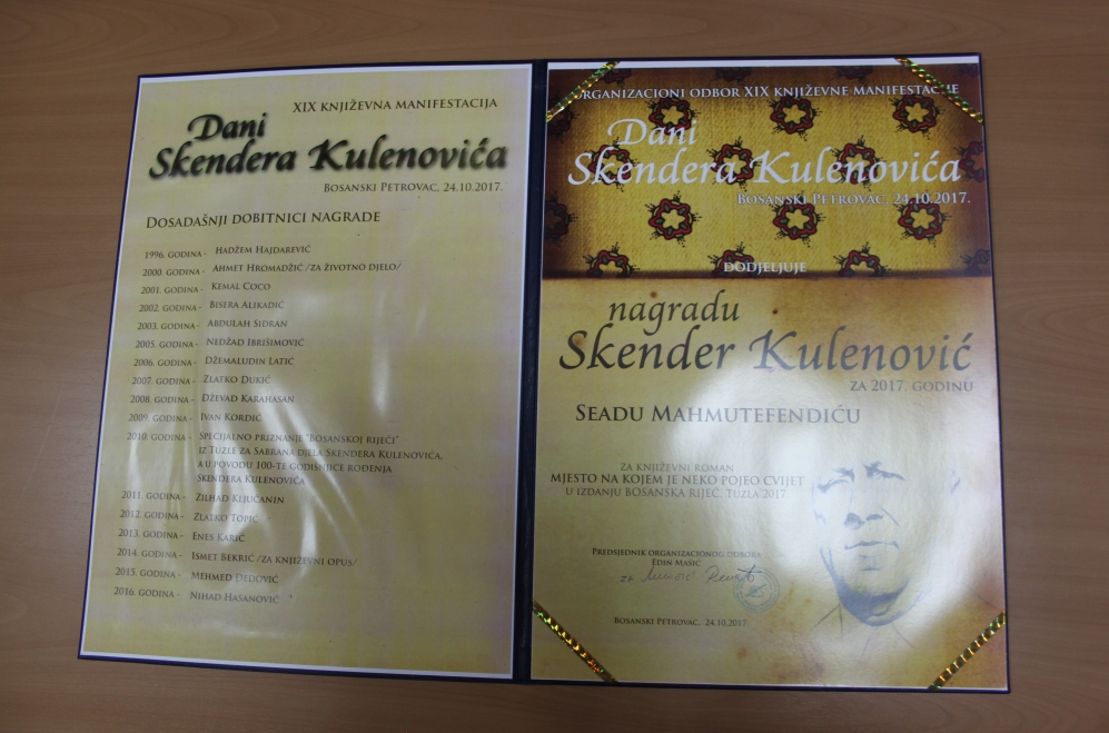 Dodjelom nagrade “Skender Kulenović” književniku Seadu Mahmutefendiću za roman “Mjesto na kojem je neko pojeo cvijet”, 24. oktobra je završena manifestacija “Dani Skendera Kulenovića”, koja je ova godine obilježena po devetnaesti put.