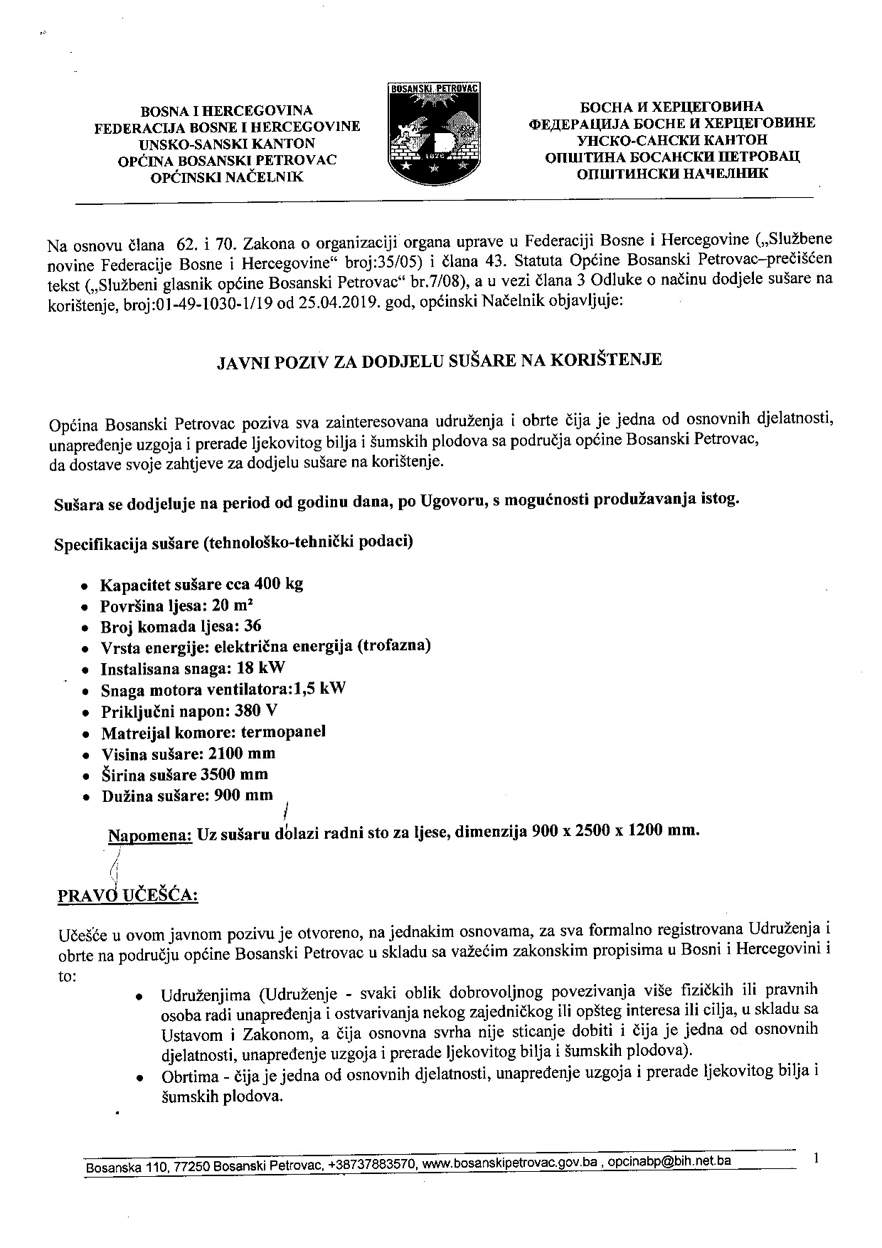 JAVNI POZIV ZA DODJELU SUŠARE NA KORIŠTENJE