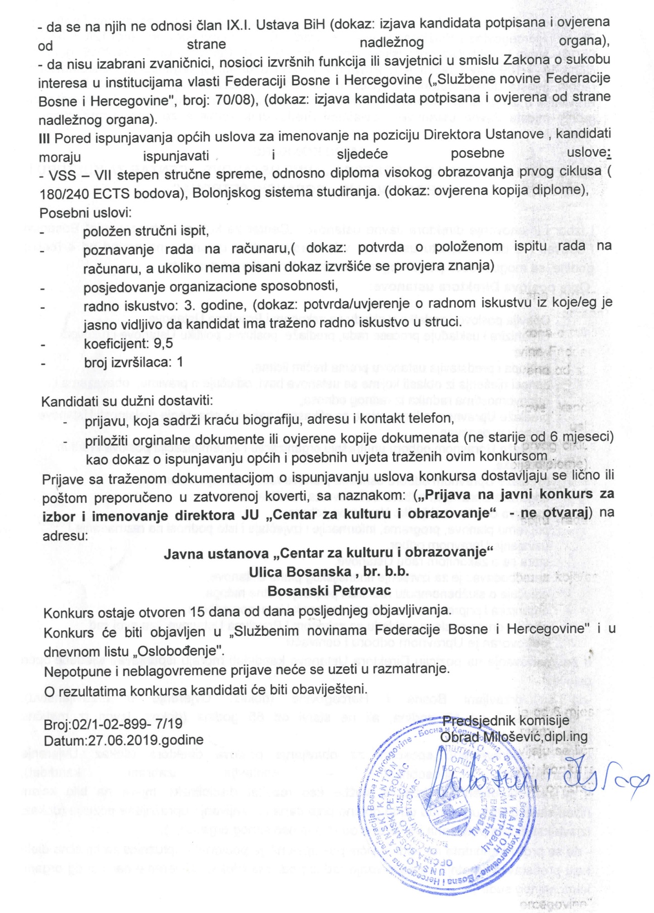 Javni konkurs za izbor i imenovanje direktora JU Centar za kulturu i obrazovanje