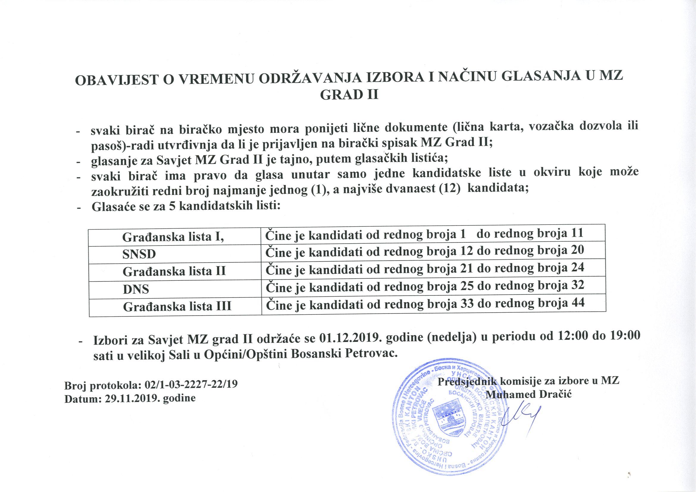 Obavijest o vremenu održava izbora i načinu glasanja u MZ Grad II